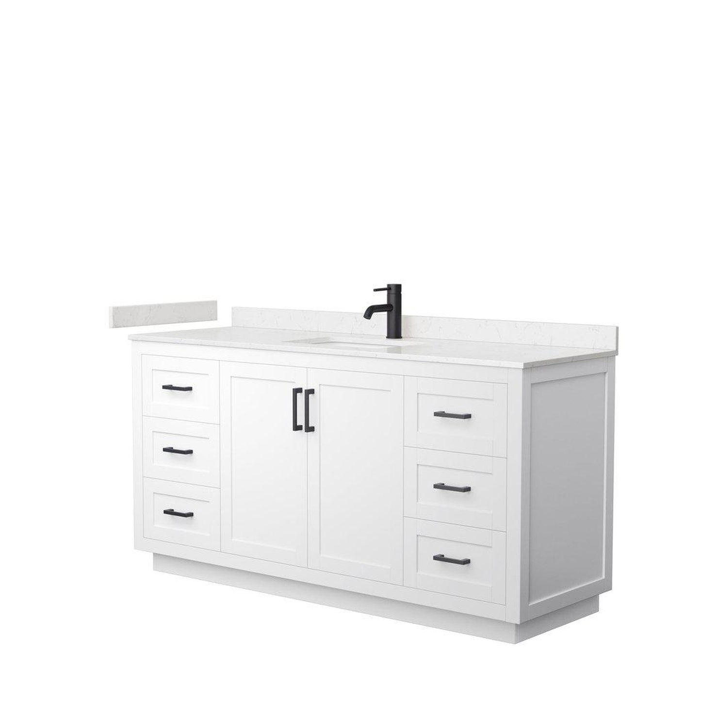 Wyndham Collection Miranda 66" Single Bathroom White Vanity Set With Light-Vein Carrara Cultured Marble Countertop, Undermount Square Sink, And Matte Black Trim
