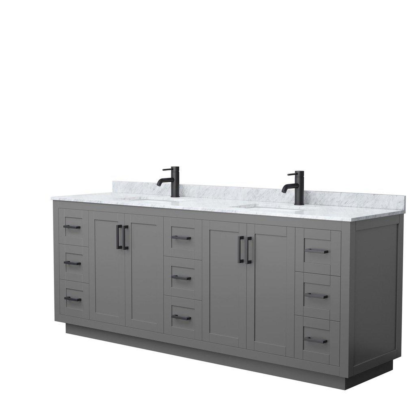 Wyndham Collection Miranda 84" Double Bathroom Dark Gray Vanity Set With White Carrara Marble Countertop, Undermount Square Sink, And Matte Black Trim