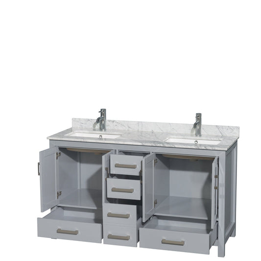 Wyndham Collection Sheffield 60" Double Bathroom Vanity in Gray, White Carrara Marble Countertop, Undermount Square Sinks, and No Mirror