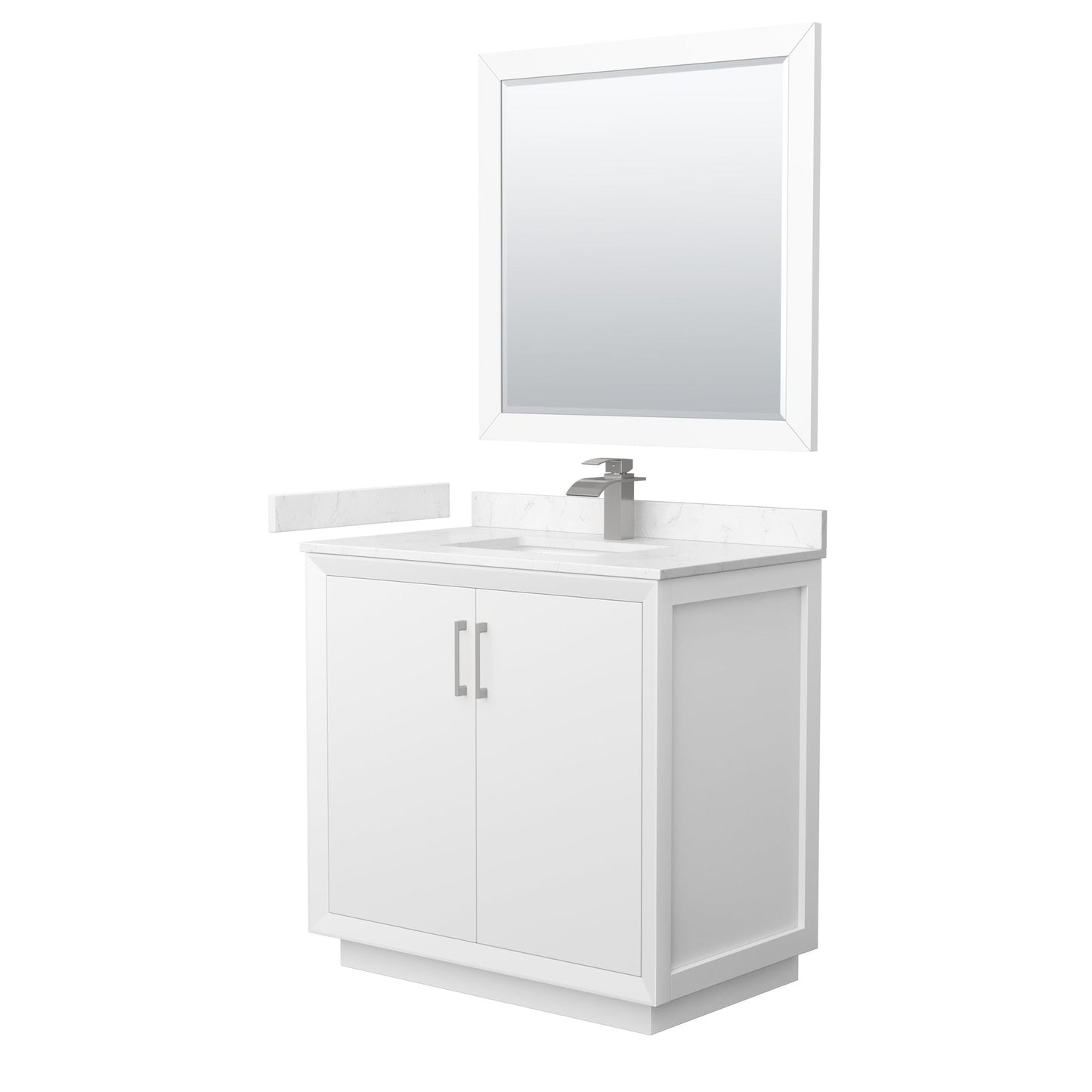 Wyndham Collection Strada 36" Single Bathroom Vanity in White, Carrara Cultured Marble Countertop, Undermount Square Sink, Brushed Nickel Trim, 34" Mirror
