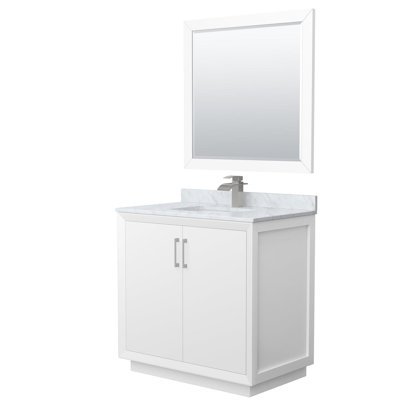 Wyndham Collection Strada 36" Single Bathroom Vanity in White, White Carrara Marble Countertop, Undermount Square Sink, Brushed Nickel Trim, 34" Mirror