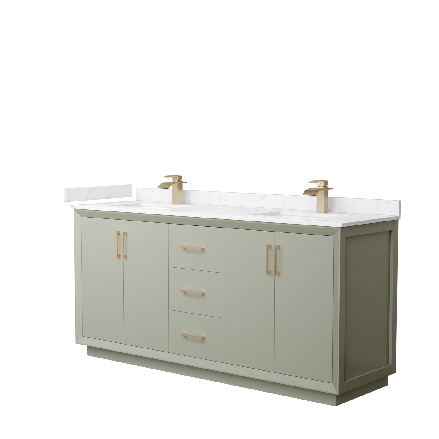 Wyndham Collection Strada 72" Double Bathroom Vanity in Light Green, Carrara Cultured Marble Countertop, Undermount Square Sinks, Satin Bronze Trim