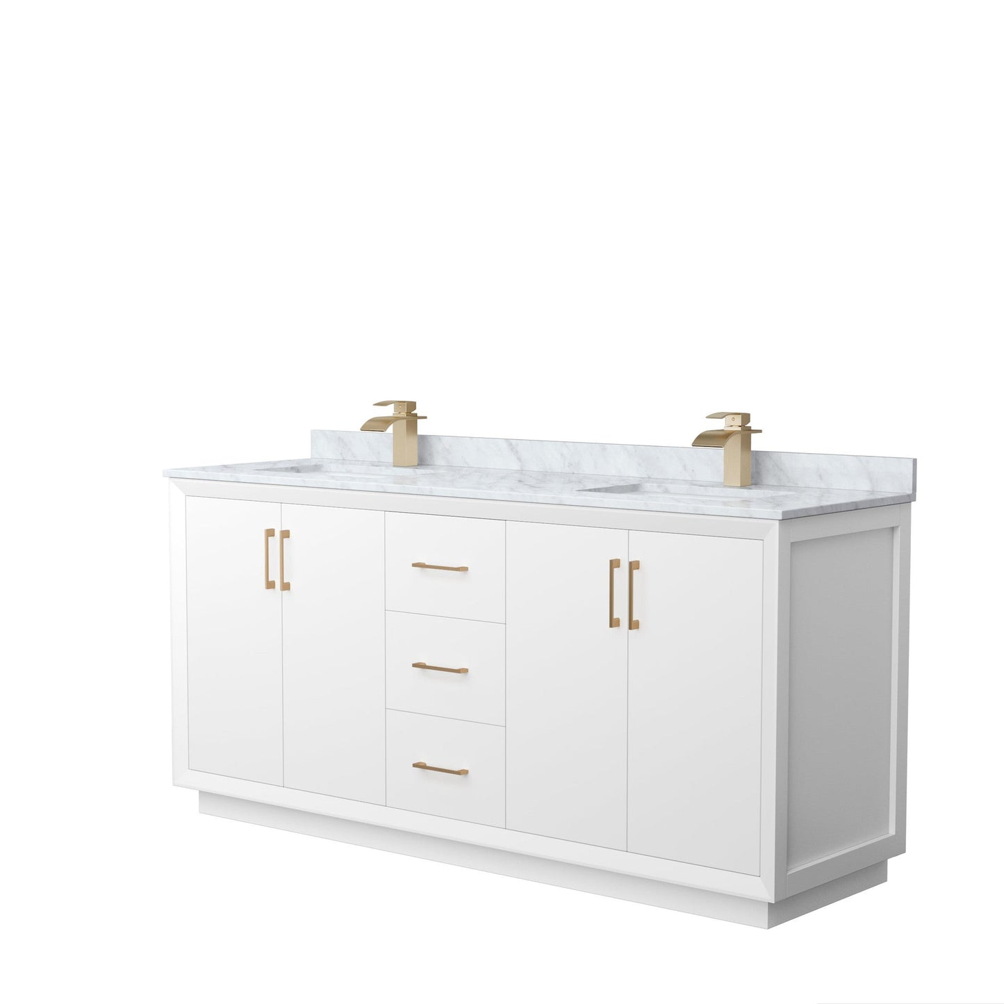 Wyndham Collection Strada 72" Double Bathroom Vanity in White, White Carrara Marble Countertop, Undermount Square Sink, Satin Bronze Trim