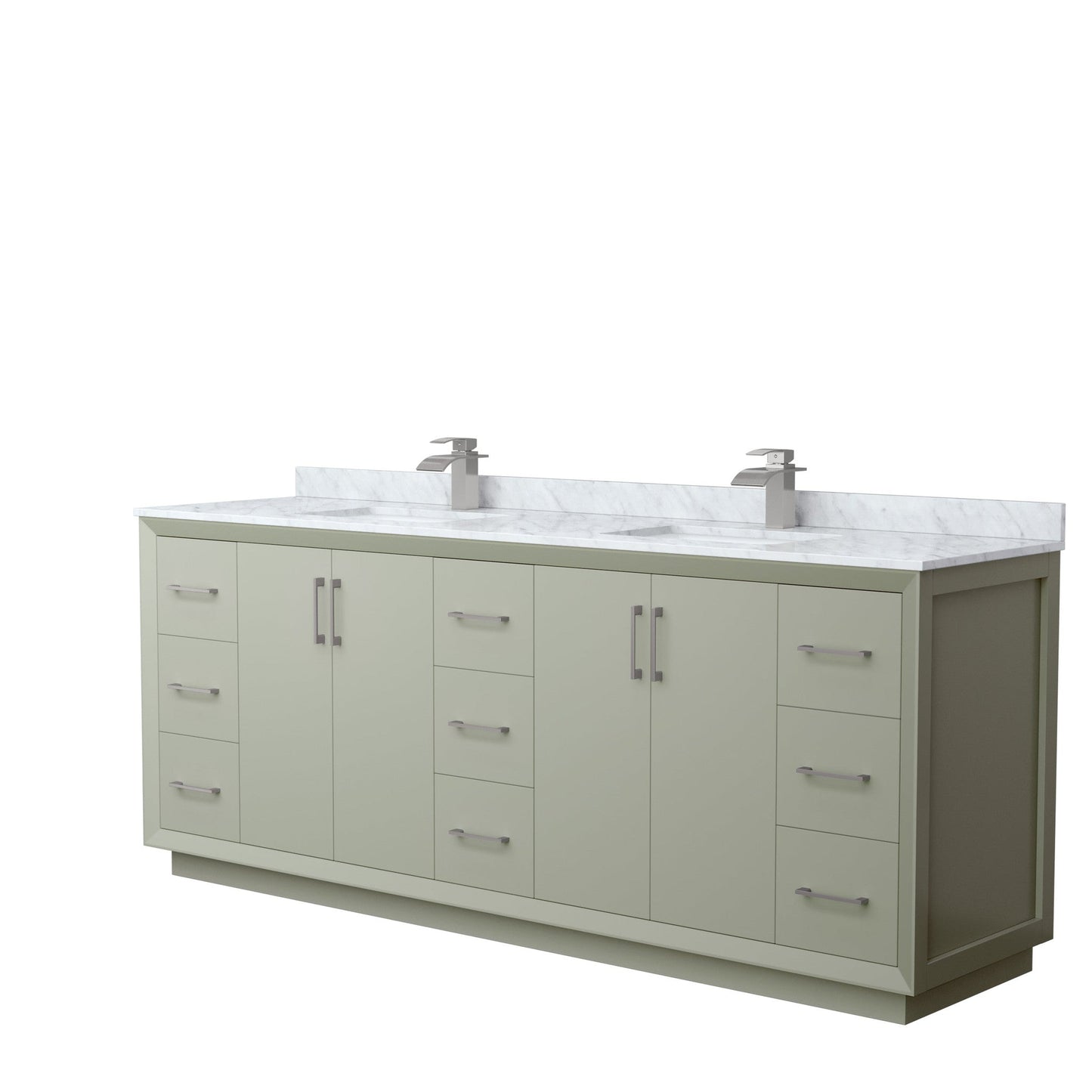 Wyndham Collection Strada 84" Double Bathroom Vanity in Light Green, White Carrara Marble Countertop, Undermount Square Sinks, Brushed Nickel Trim