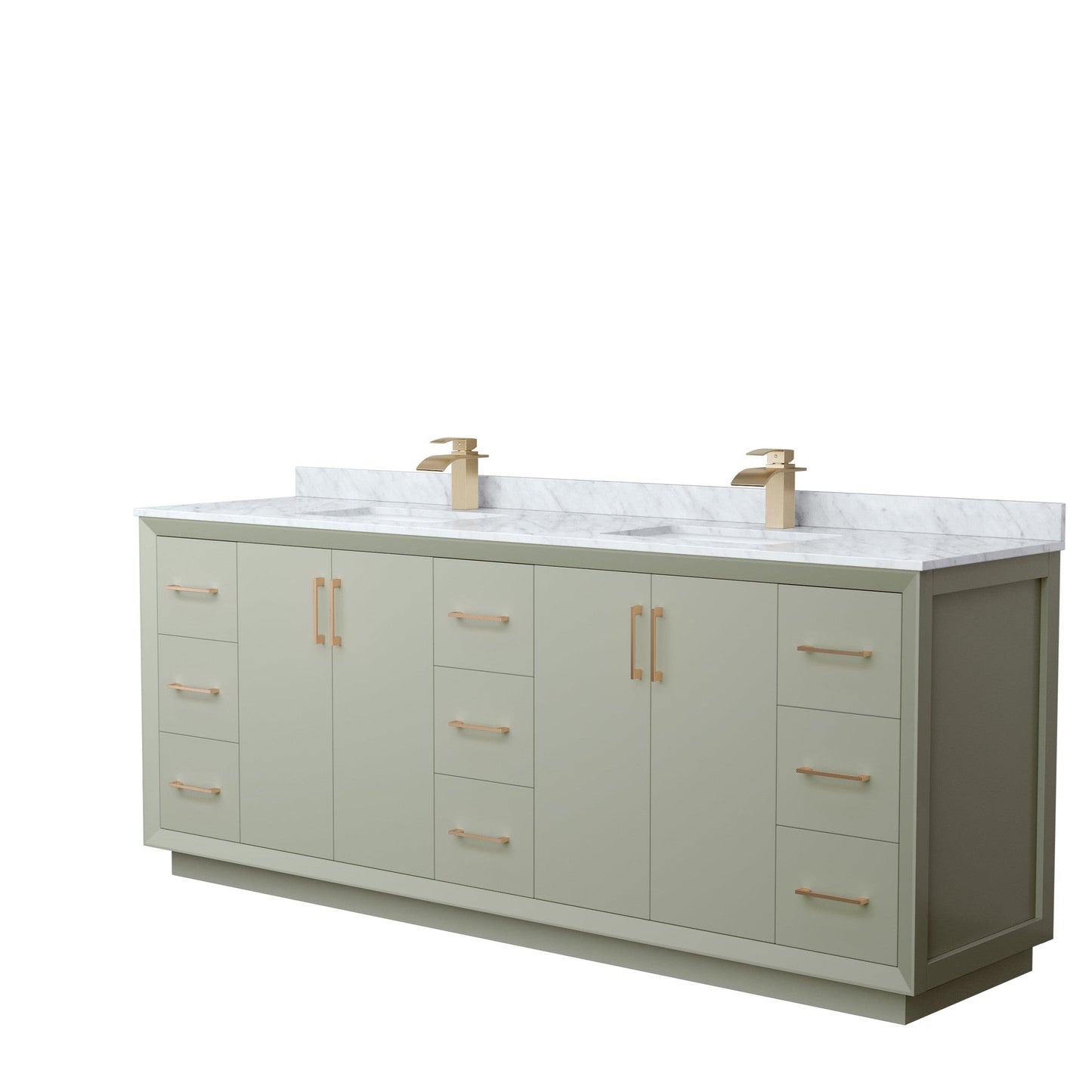 Wyndham Collection Strada 84" Double Bathroom Vanity in Light Green, White Carrara Marble Countertop, Undermount Square Sinks, Satin Bronze Trim