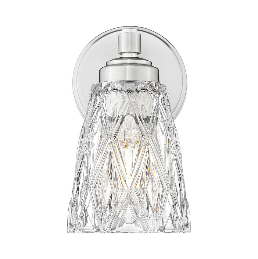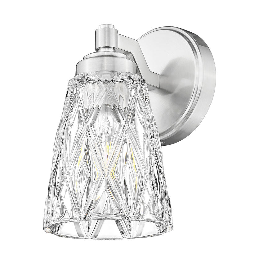 Texture embellishes sparkling glam in a one-light wall sconce lifting the ambience of interior living spaces. Classic materials of glass and metal merge to offer a fixture featuring overlapping diamond patterning on a conical clear glass shade, filtering against harsh glare. Brushed nickel framing complements this dimmable light source perfect for bath spaces and sophisticated living rooms.