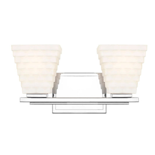 Layered rectangles of opal glass create modern artistry and dimension for the shades on this modern two-light vanity bath light. Perfect for bright uplighting, the fixture features a layered detail on its arm and backplate, which showcase a gleaming chrome finish perfect for a variety of interior decor styles. Clean and refined, it sets just the right ambiance in a contemporary space.