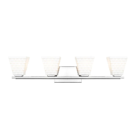 The bright ambiance of a chrome finish creates fresh, contemporary appeal for this modern four-light vanity bath light. Its simple structure includes a layered backplate and arm, each adding texture to the overall aesthetics of the fixture. Four shades feature layered opal glass rectangles that create a tapered square silhouette, offering bright, diffused illumination perfect for daily rituals.
