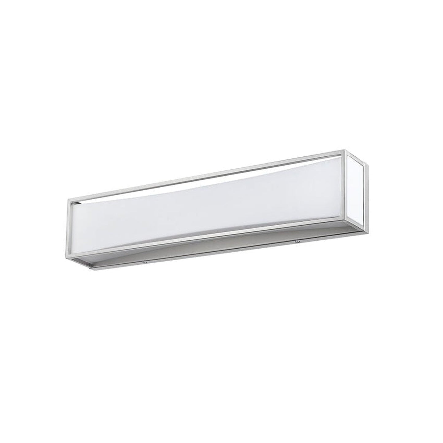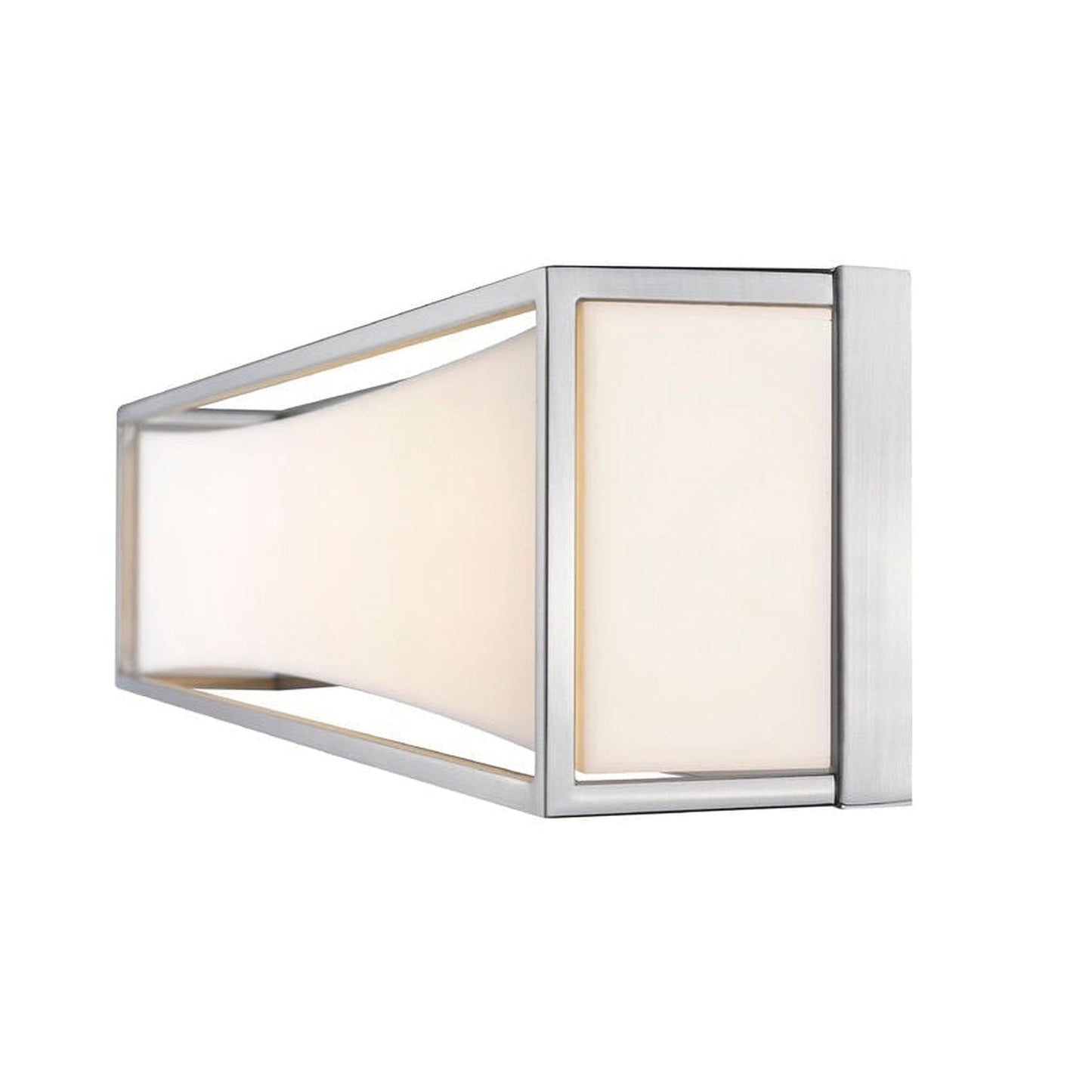 Sleek, gleaming lines of brushed nickel finish metal give this two-light vanity light a clean, modern look. Perfect for a powder room, it boasts a delicate, frosted white shade that diffuses the light into a soft, graceful glow.