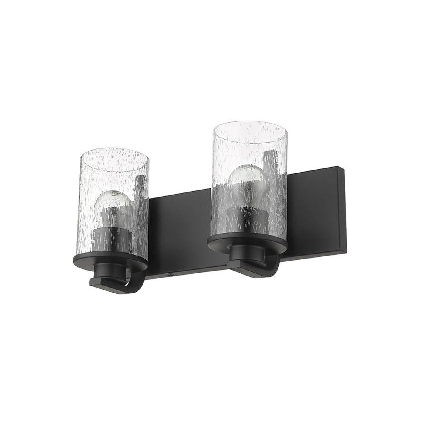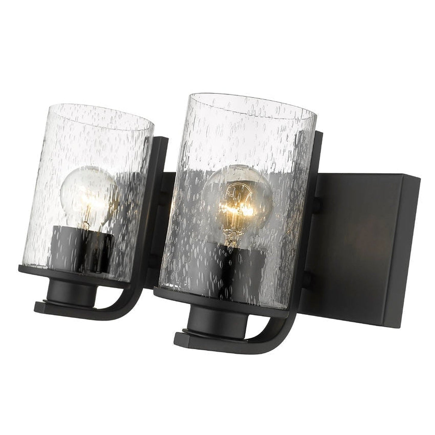 The romantic effect of clear seedy glass adds a custom design element to this contemporary two-light vanity, a great choice for illuminating modern bath and dressing spaces. Glass shades embellish and contrast with the minimalist yet stylish look of steel frames and mounts made of bold matte black finish steel. This two-light vanity light from the Beckett collection dresses up a compact bath space with sophistication.
