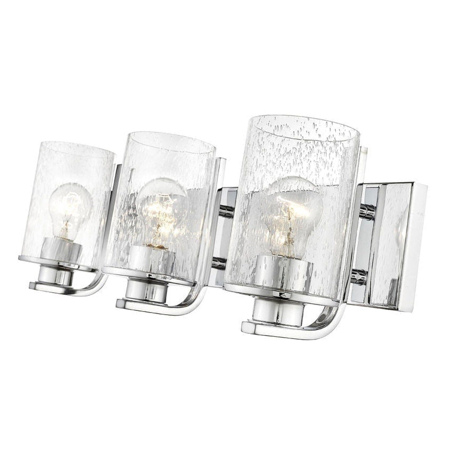 Light up a modern or transitional bath space with this elegant three-light vanity light from the Beckett collection. Showcasing a hint of village nautical fare, its romantic clear seedy glass cylinder shades offer a heady effect. A rectangular steel mount and accents fashioned of bright chrome finish steel deliver a tasteful aesthetic.