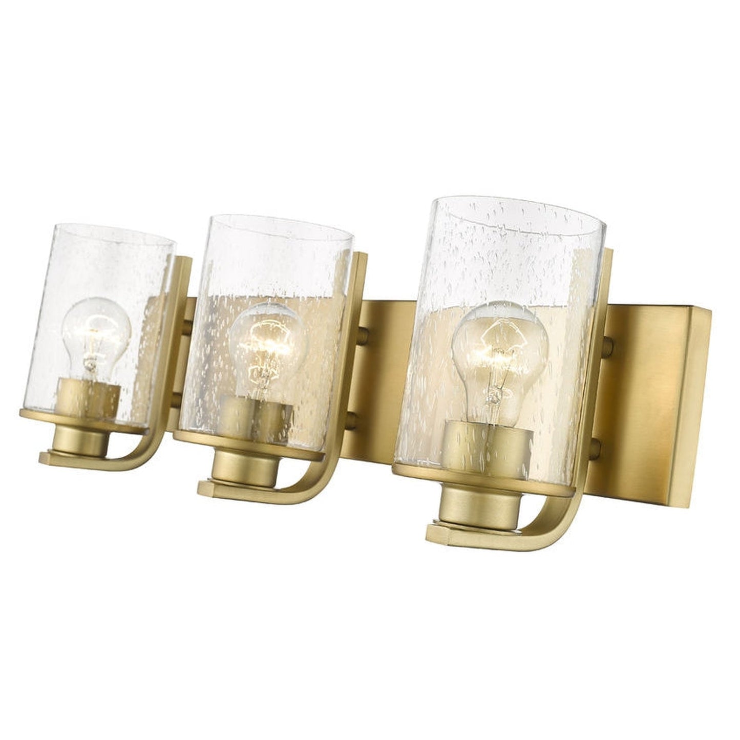 Light up a modern or transitional bath space with this elegant three-light vanity light from the Beckett collection. Showcasing a hint of village nautical fare, its romantic clear seedy glass cylinder shades offer a heady effect. A rectangular steel mount and accents fashioned of warm olde brass finish steel deliver a tasteful aesthetic.