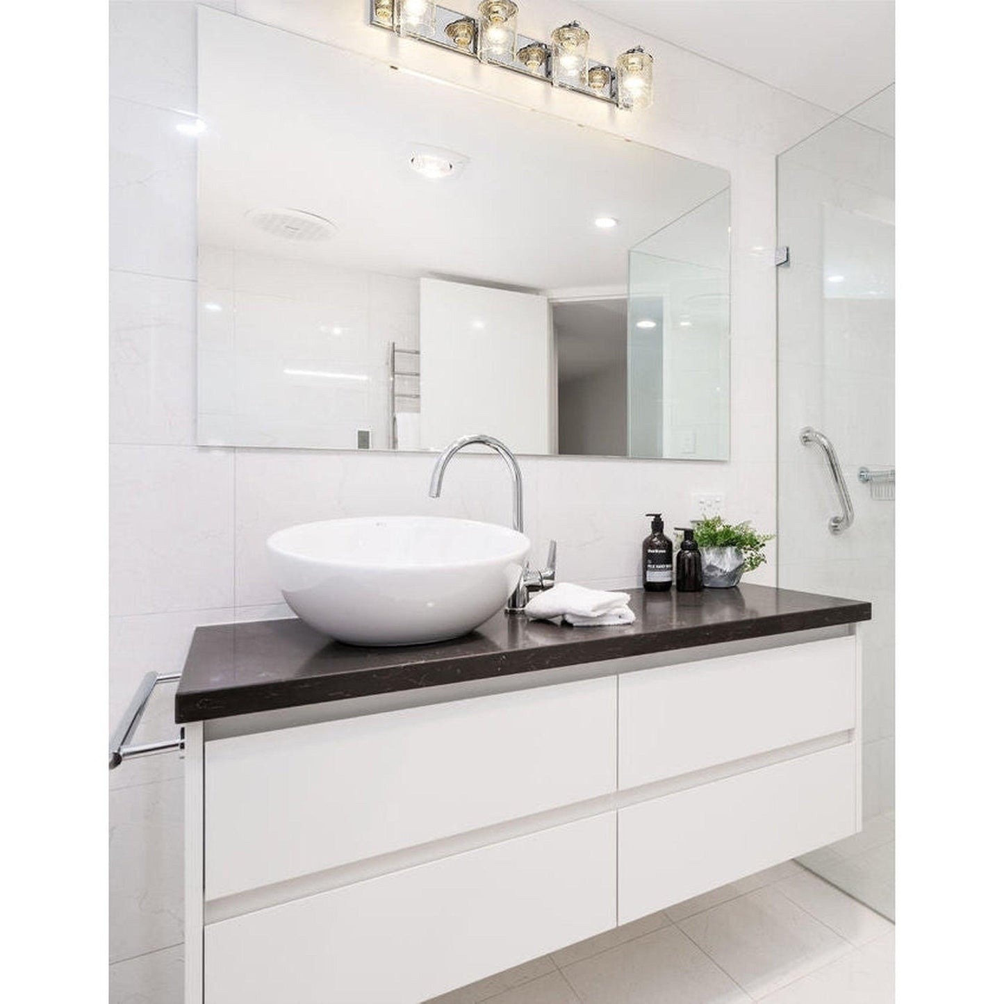 This four-light vanity light from the Beckett collection offers a minimalist look with customized materials. Create a sophisticated aesthetic in a mid-sized bath or dressing space with a fixture formed of bright chrome finish steel and highlighted with the romantic look of cylindrical clear seedy glass shades.