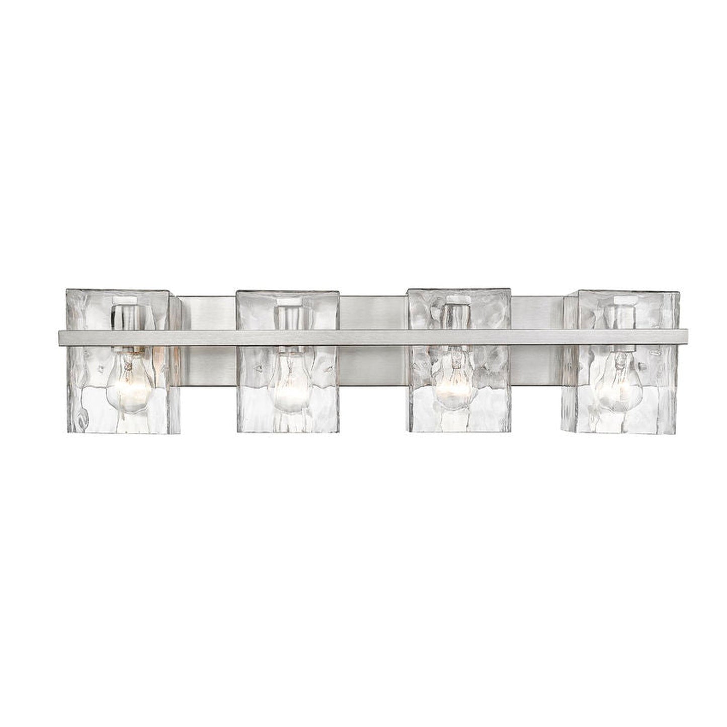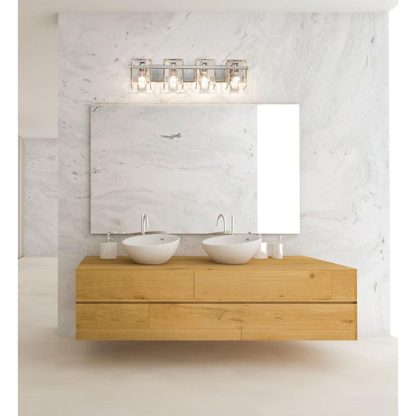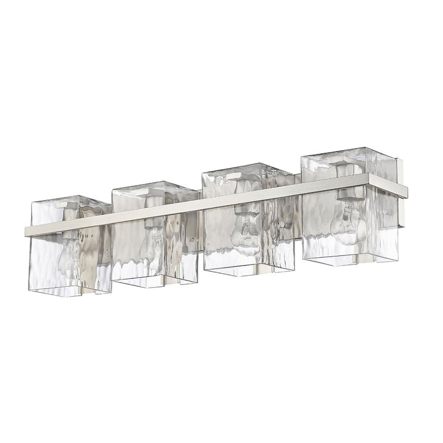 This four-light vanity light with clear glass shades brings a sophisticated expression for your bathroom lighting. Rippled shades provide an eye-catching texture while the steel construction is finished in brushed nickel.