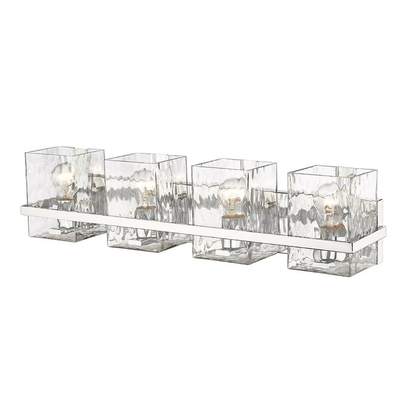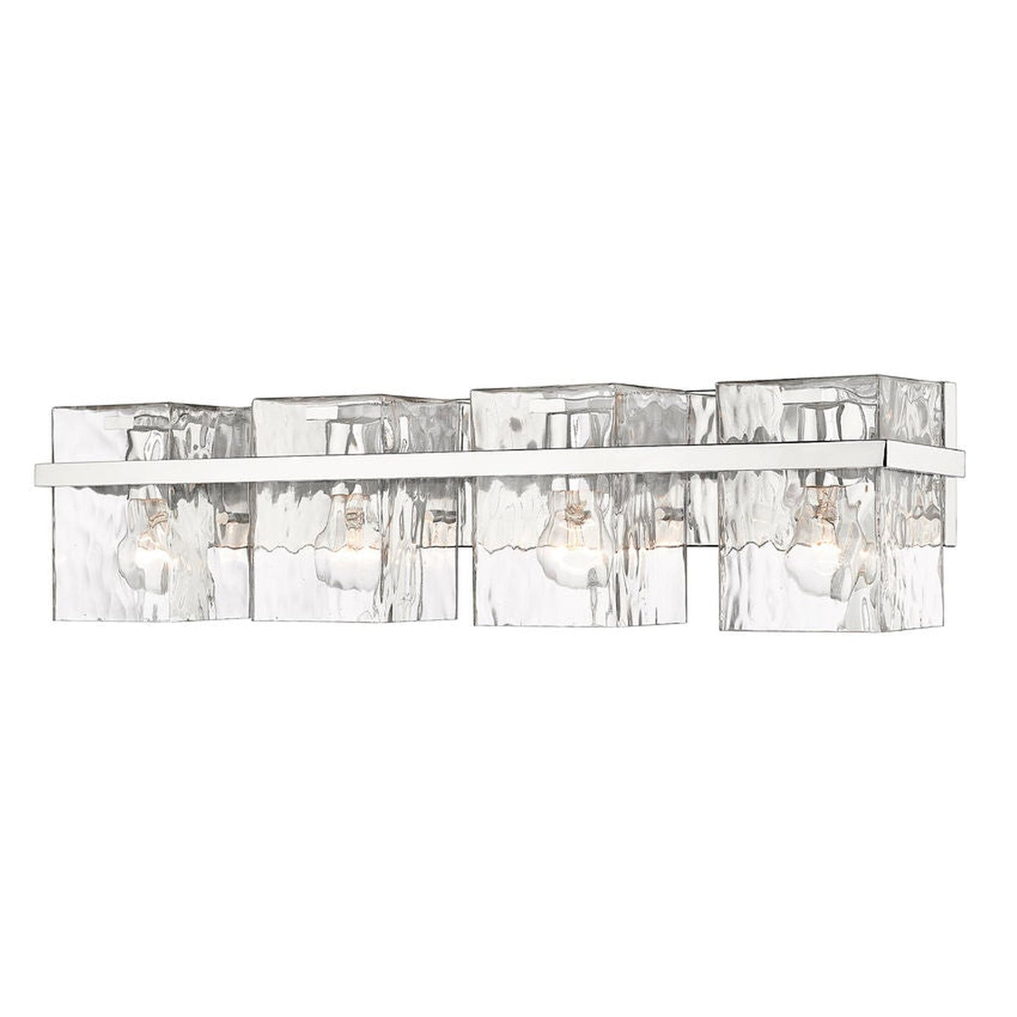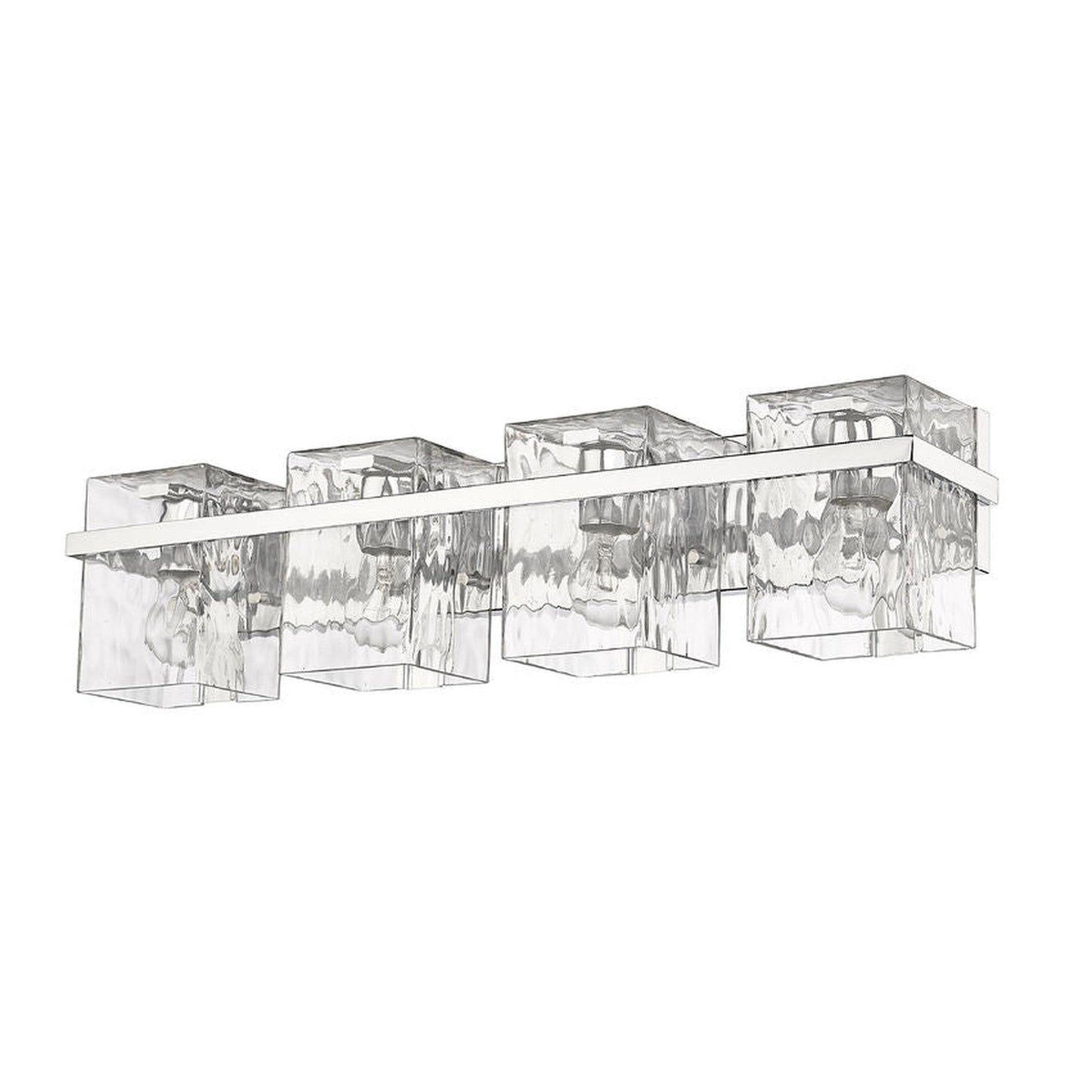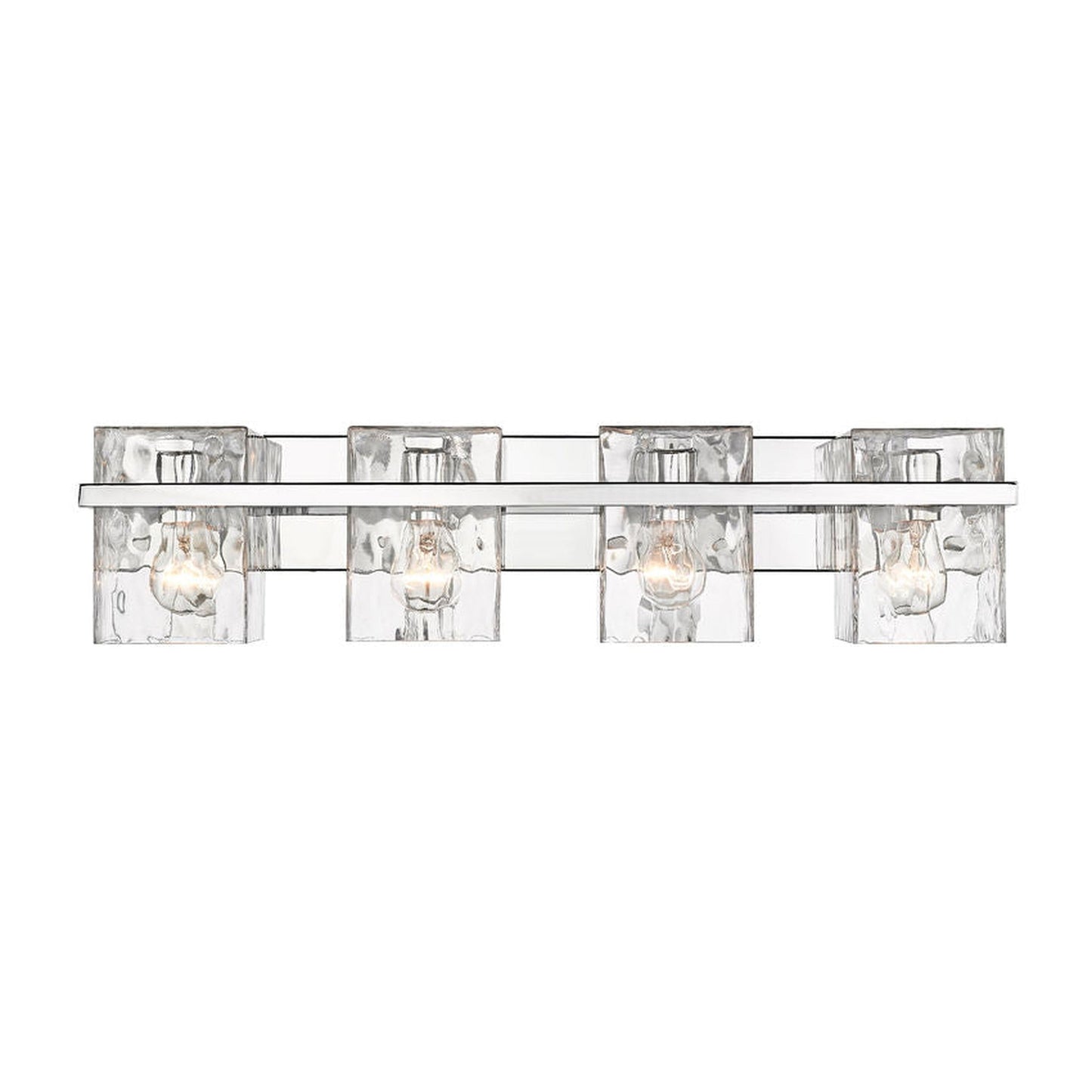This four-light vanity light with clear glass shades brings a sophisticated expression for your bathroom lighting. Rippled shades provide an eye-catching texture while the steel construction is finished in chrome.