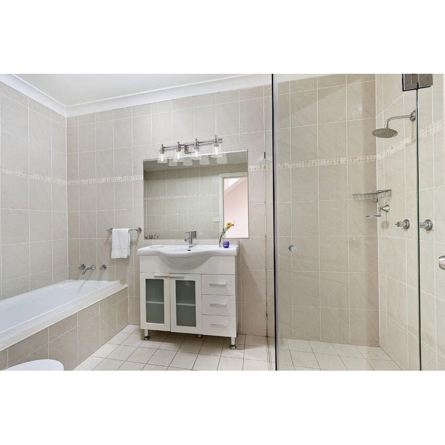 Frame a master or guest bath sink with elegance, and add this brushed nickel four-light vanity light to a new or remodeled bath space. Contemporary and transitional, its versatile motif hits on a beautiful blend of durable steel and soft, delicate bell shades fashioned from clear seedy glass.