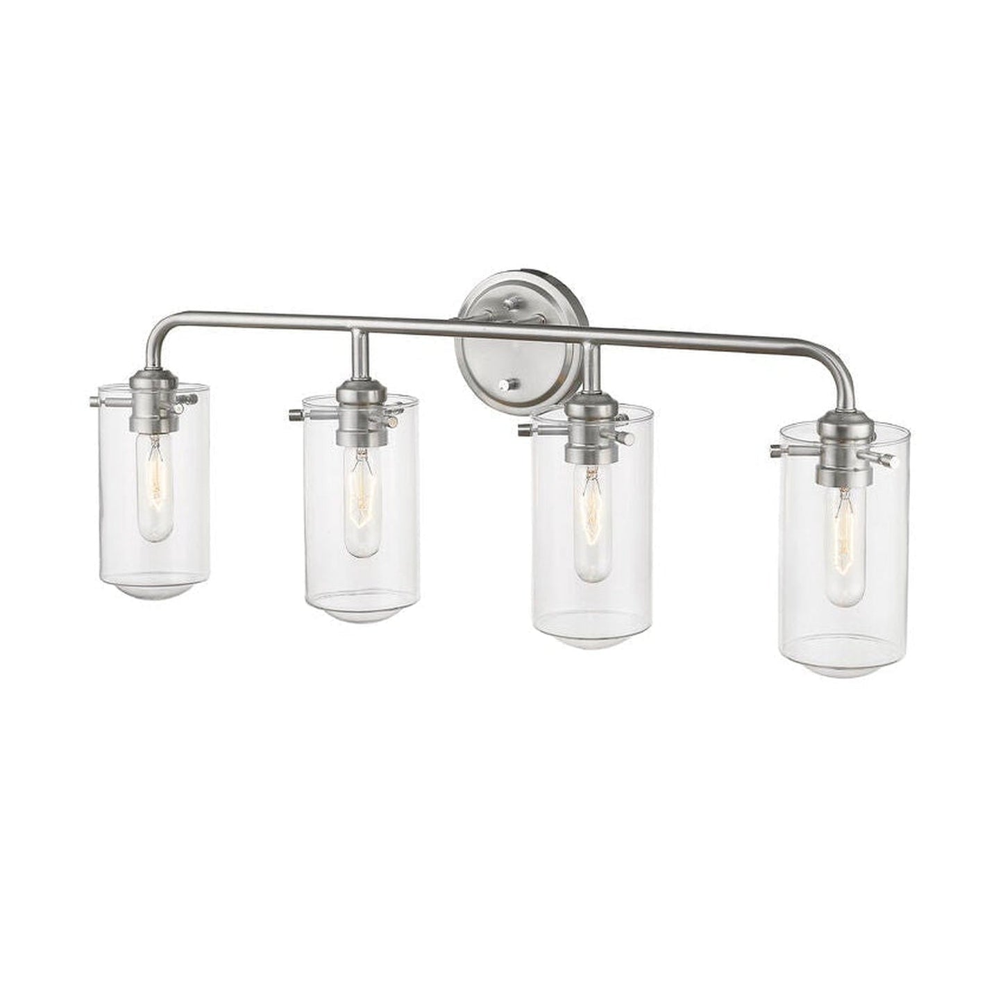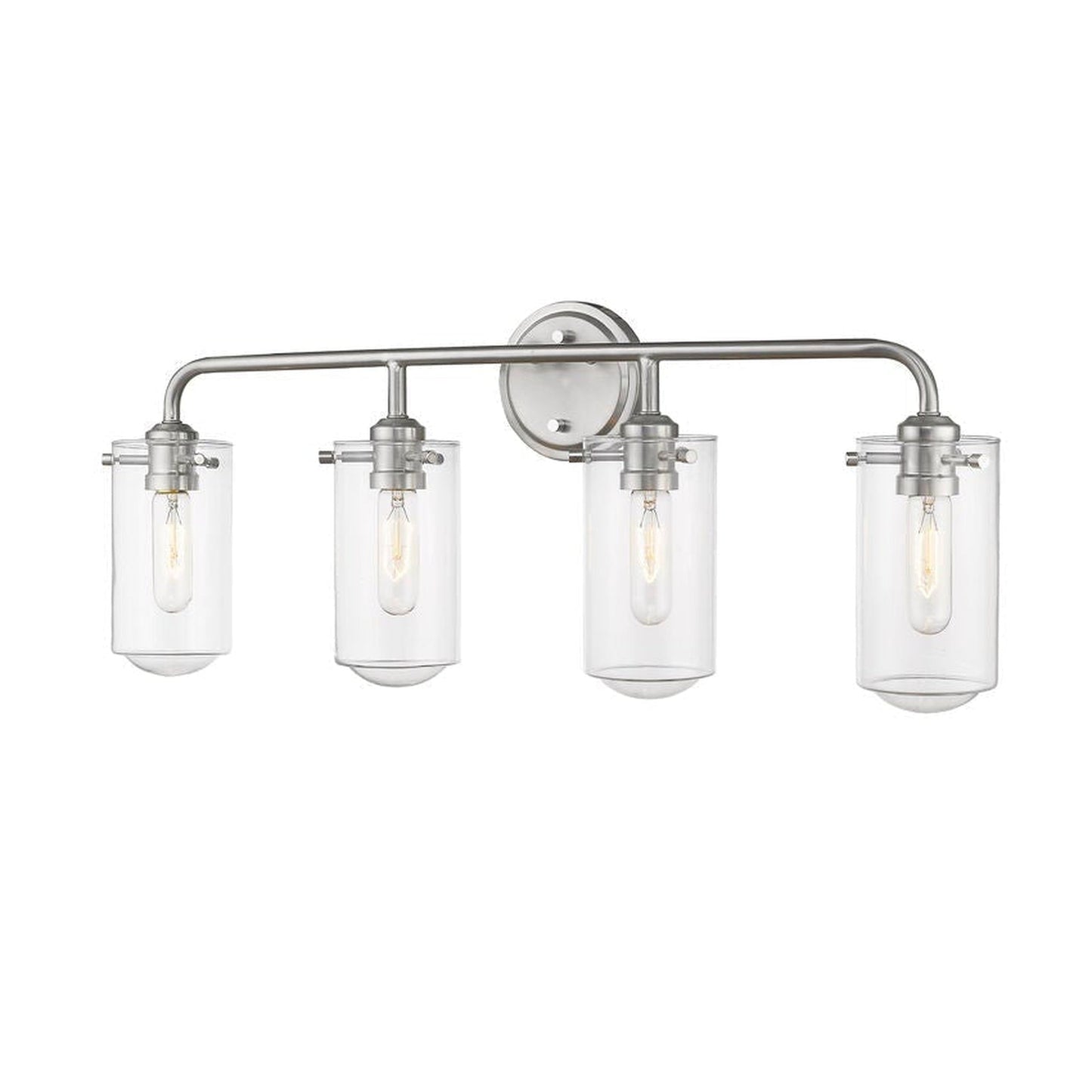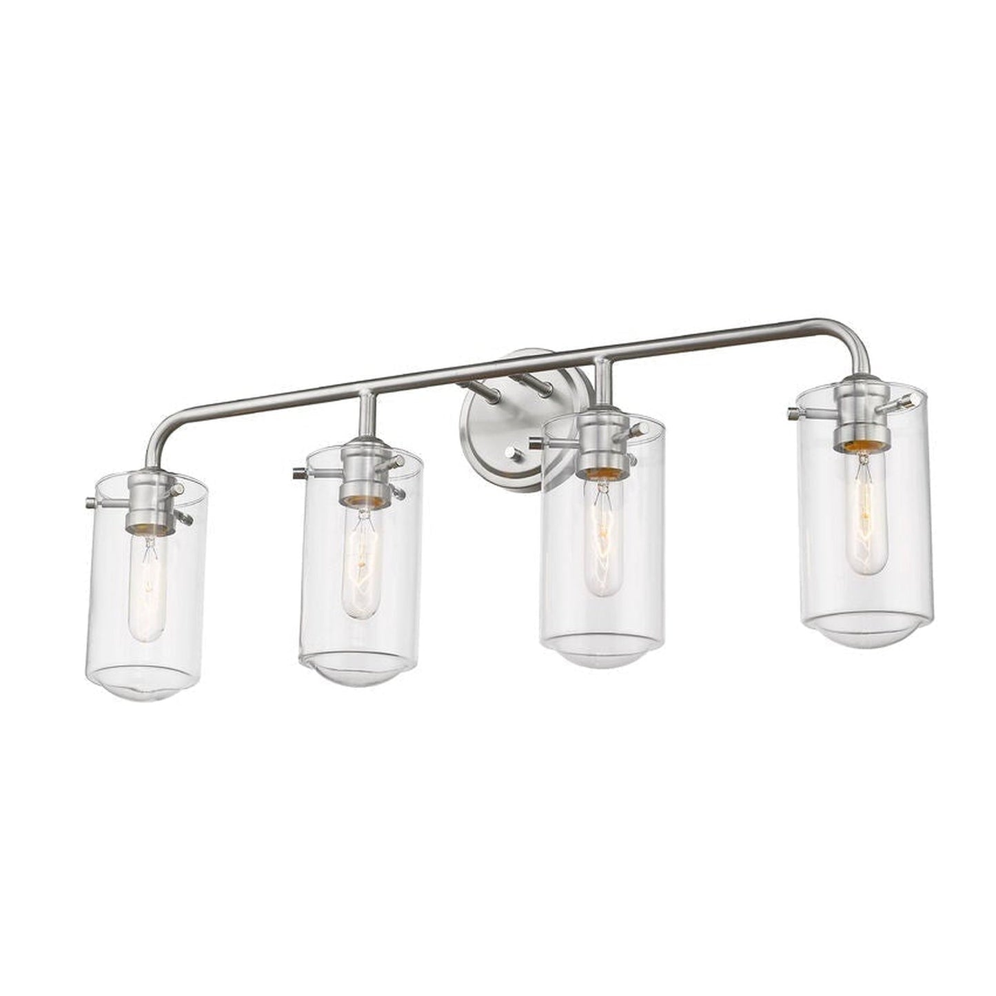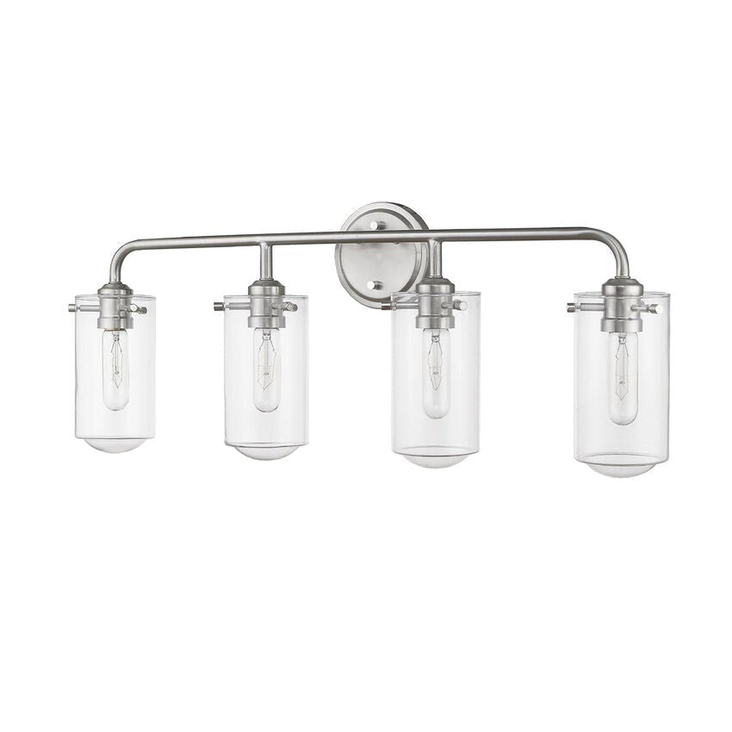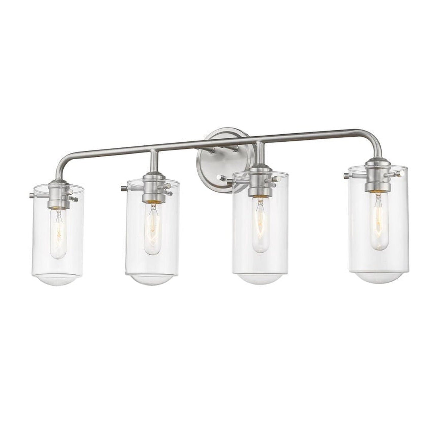 All eyes avert upward to take in the beautiful design of this four-light bath light. Gorgeous brushed nickel steel and clear glass shades form a delicate look with an edgy industrial aesthetic.