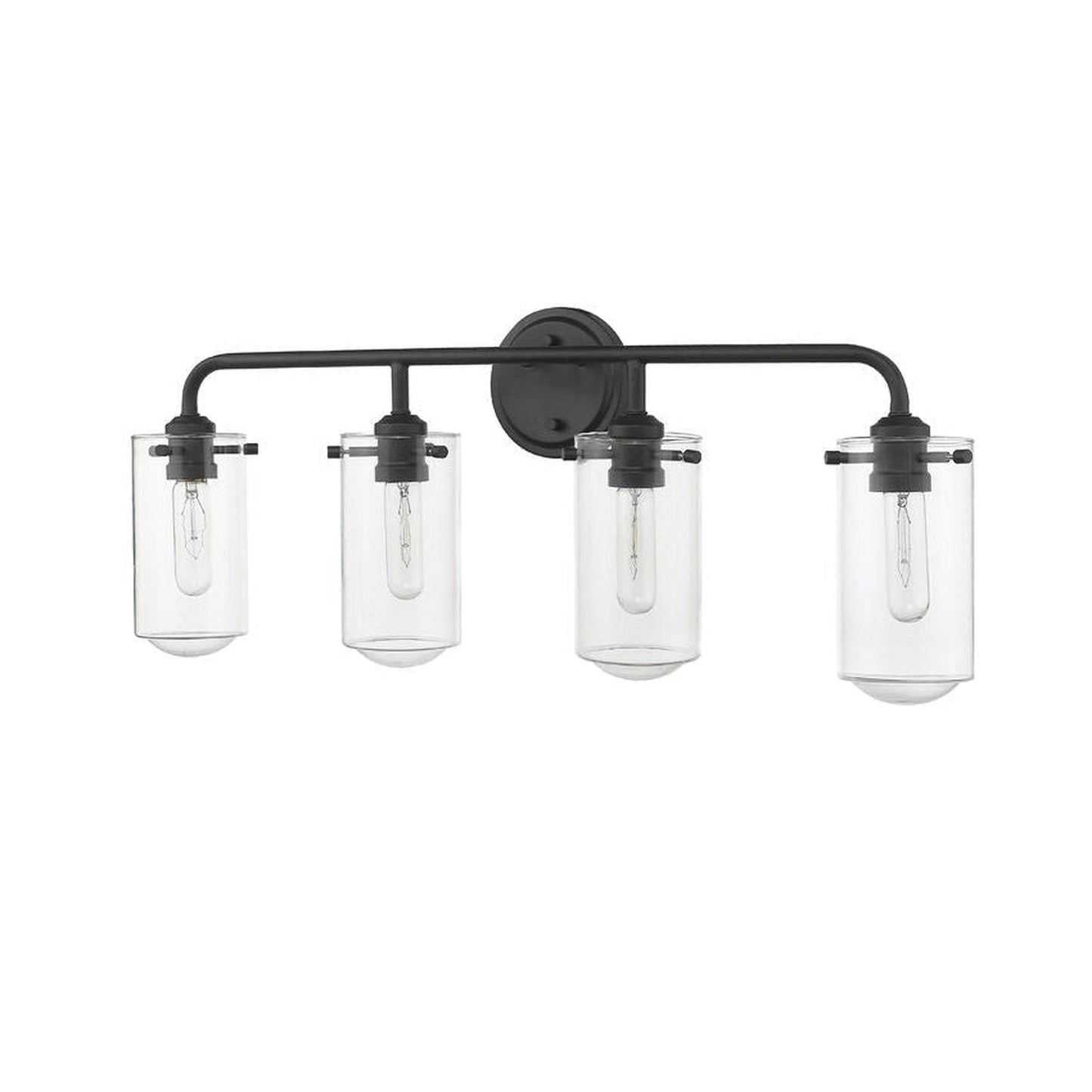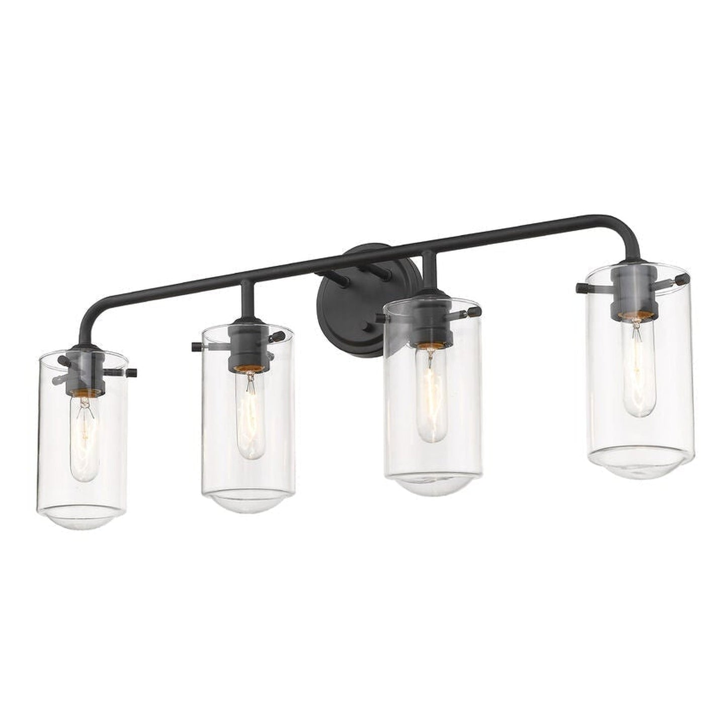 This four-light bath light offers a dynamic look that frames a master or guest bath vanity in style. Delicate clear glass shades join an industrial-themed frame and mount with a cool matte black finish.