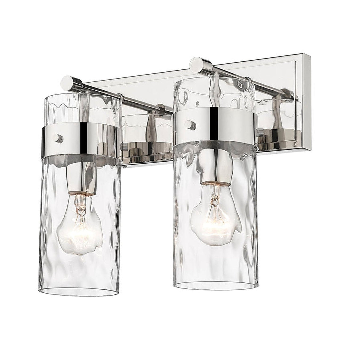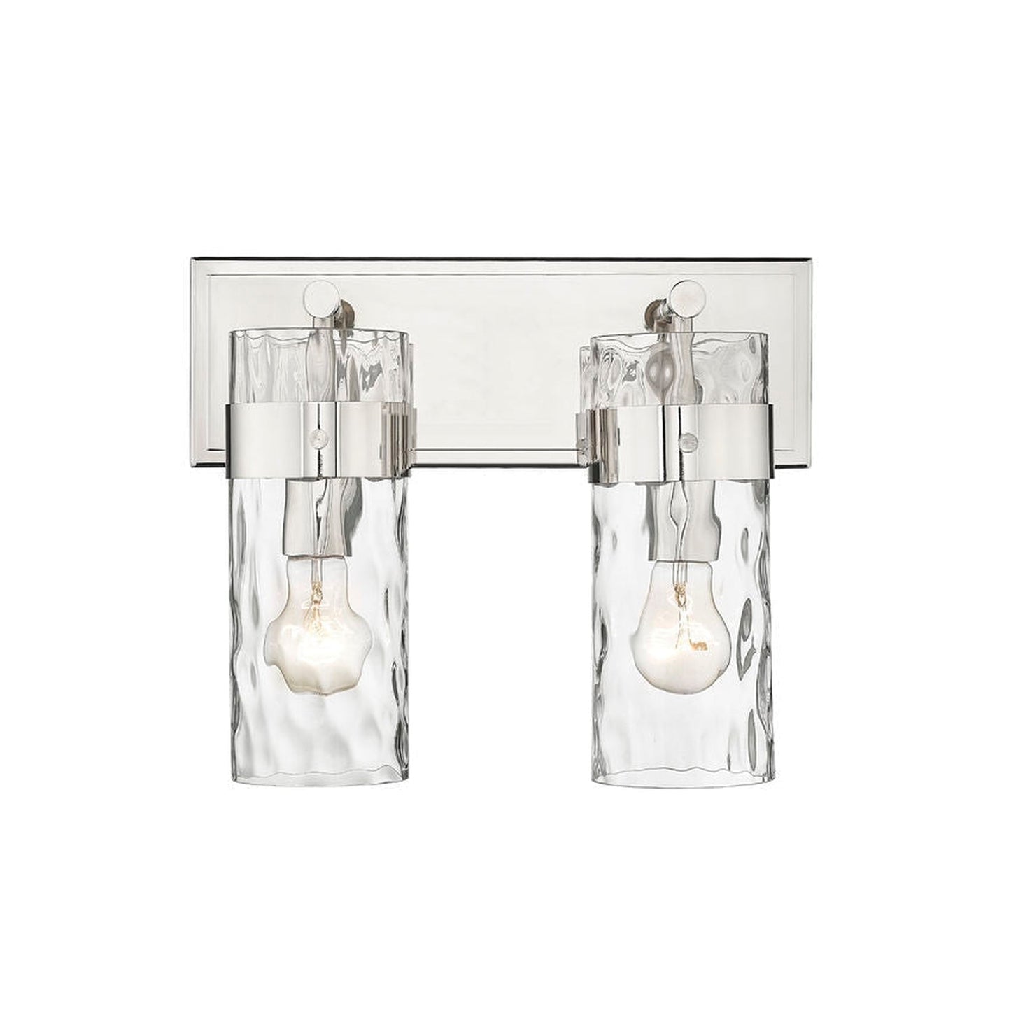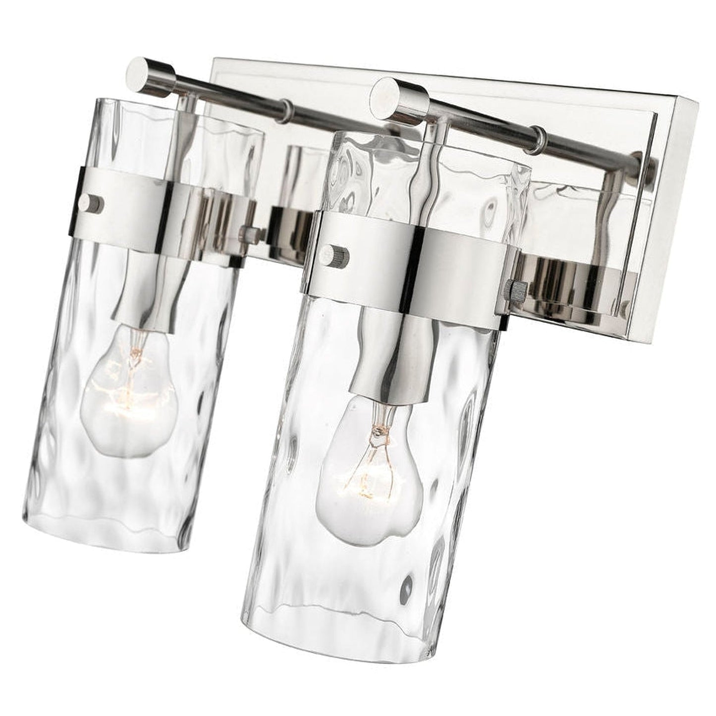 A clean, classic feel that blends with any decor, this two-light vanity fixture flaunts a polished nickel finish and steel construction. The glass cylinder shade is enhanced with a ripple texture and ensures the perfect ambiance in hallways or bathrooms.