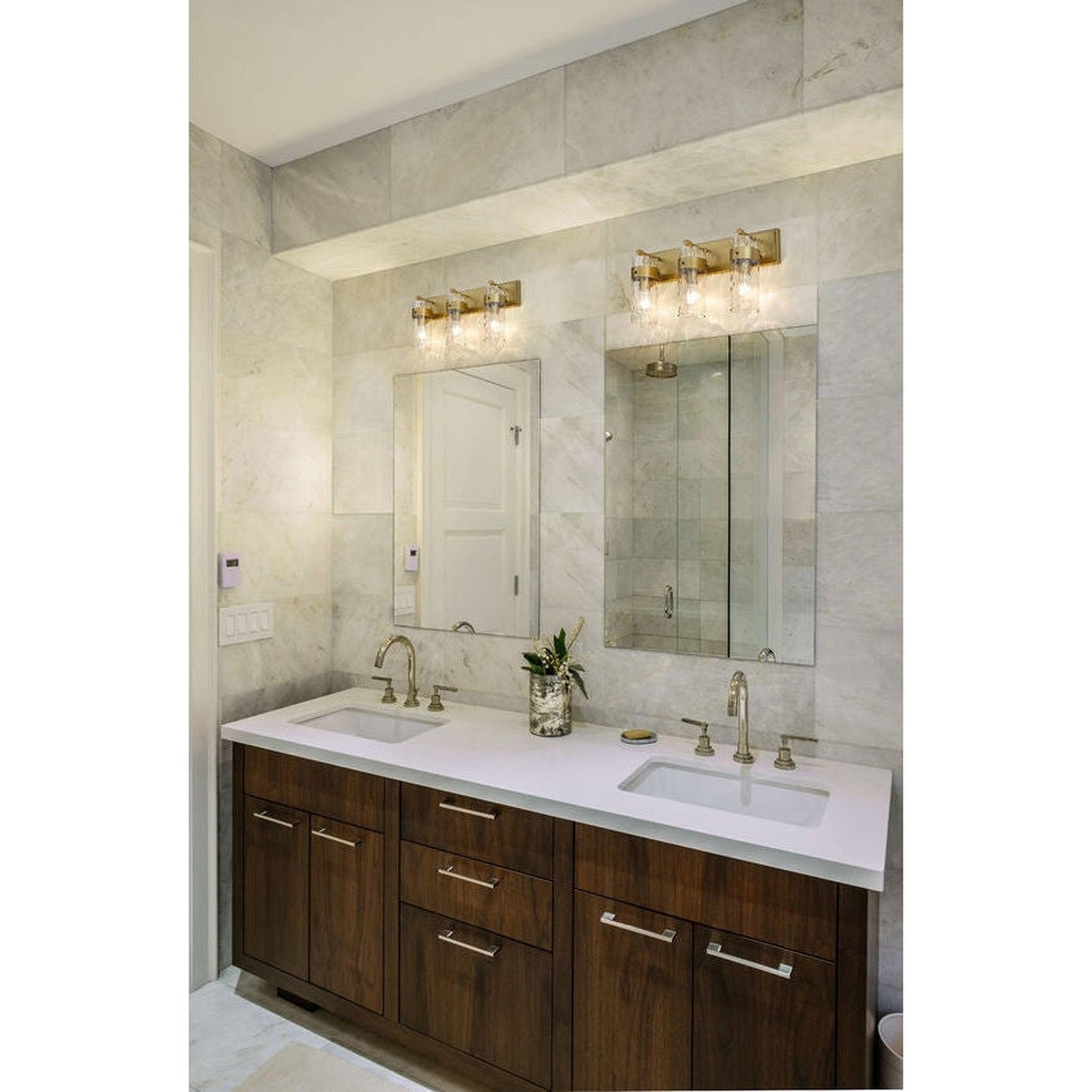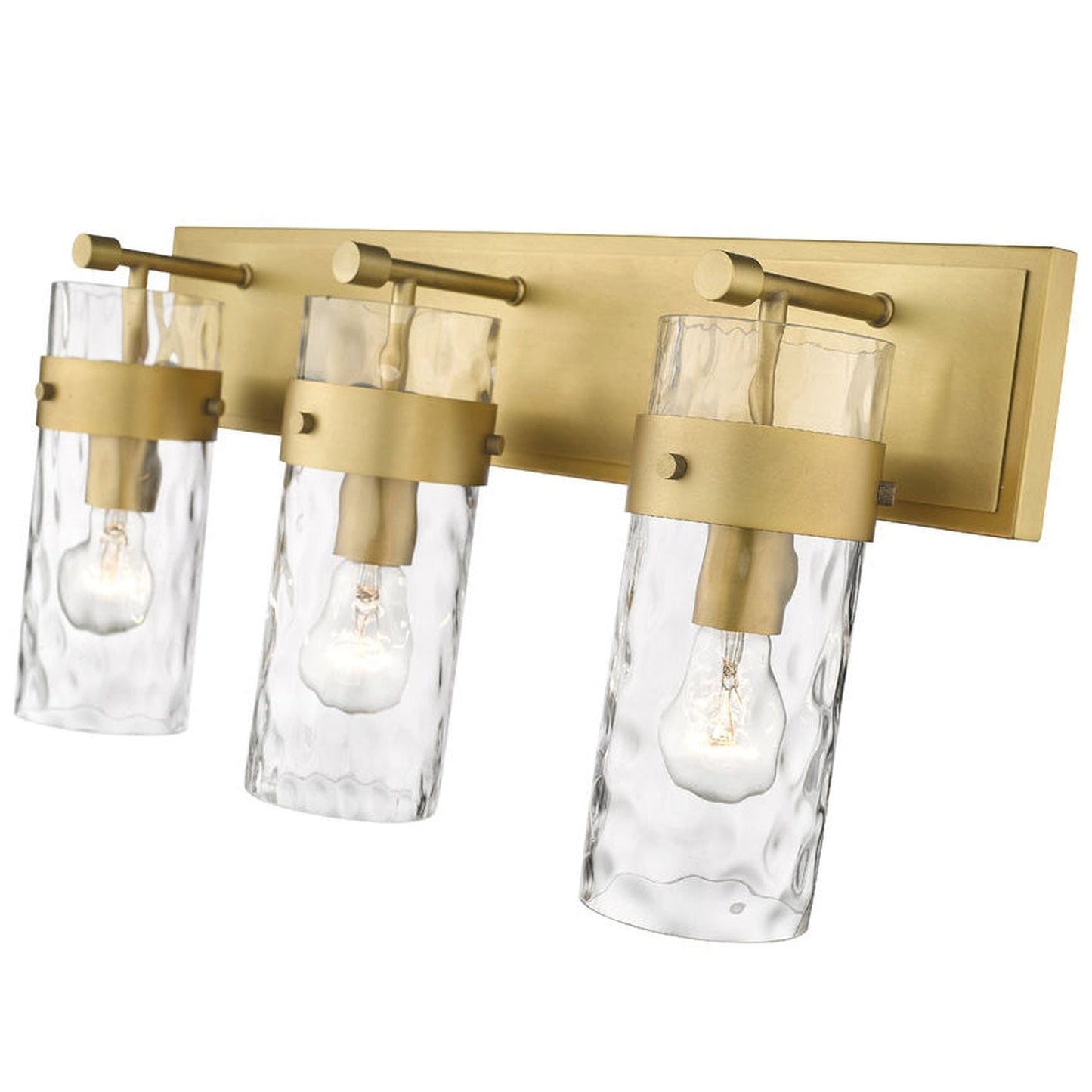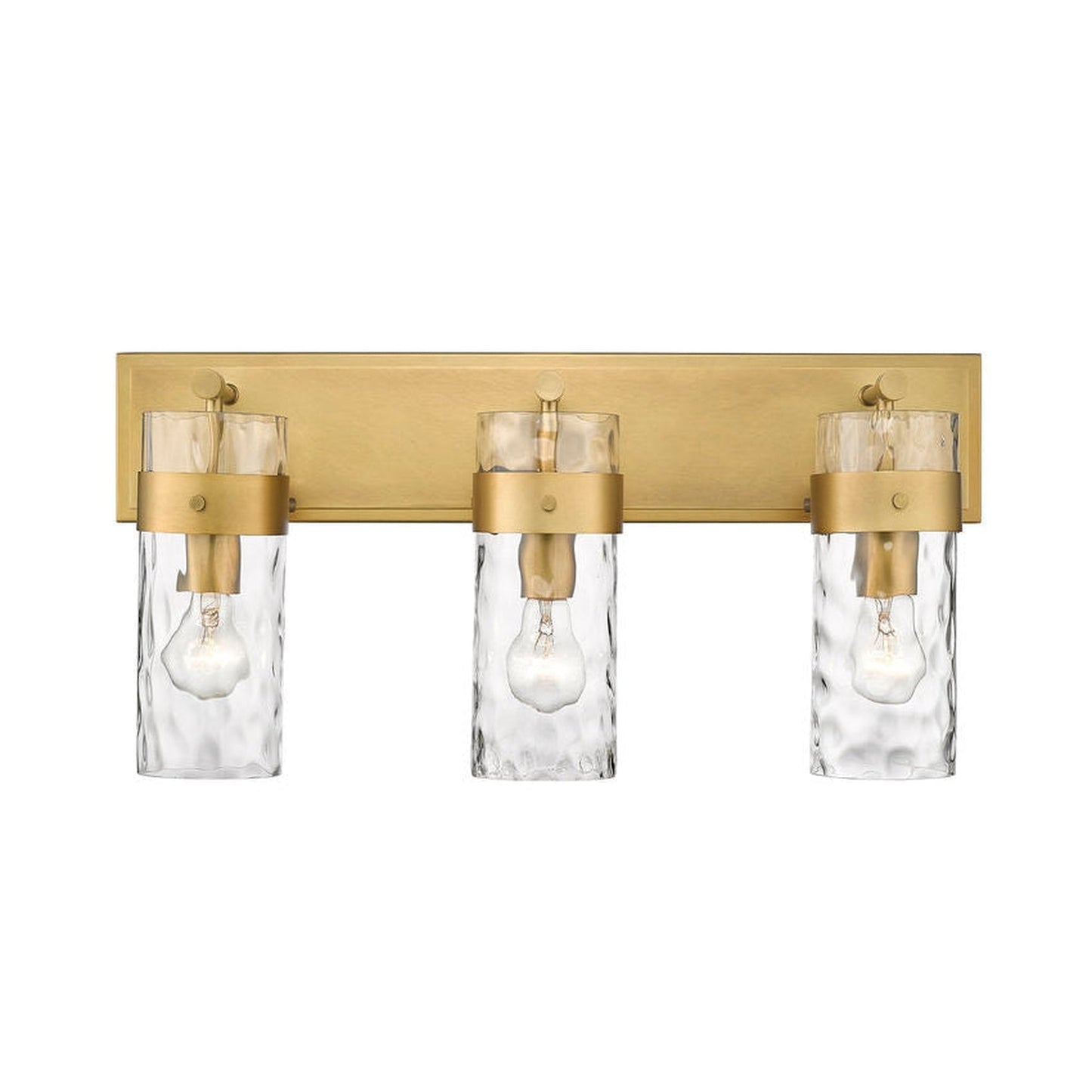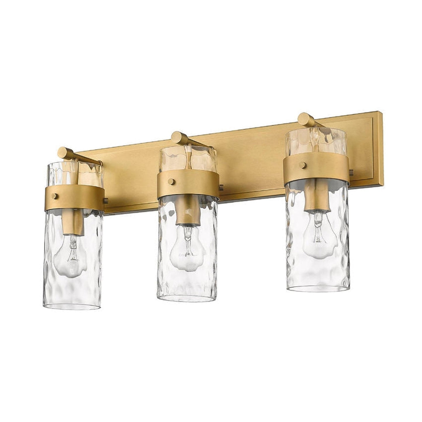 A clean, classic feel that blends with any decor, this three-light vanity fixture flaunts a rubbed brass finish and steel construction. The glass cylinder shade is enhanced with a ripple texture and ensures the perfect ambiance in hallways or bathrooms.