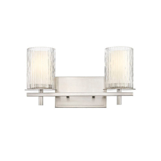 Timeless beauty follows the layered multi-part design of a glass and steel two-light vanity light, a perfect solution for conquering lighting challenges in a contemporary space. Intricate detail is textural and artisan with clear glasswork in a cylinder shape, with an inner white diffuser. Etched opal and clear glass blend as they enhance chic brushed nickel finish framing and show off a crisp mix of circles and lines.