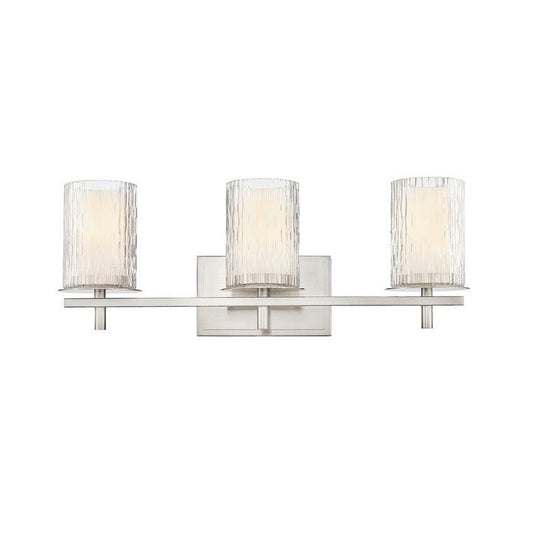 Add an exquisite look in contemporary bath fixtures, highlighting contrast in a three-light vanity light with a timeless motif. Intricate detail is textural and artisan with clear glasswork in a cylinder shape, with an inner white diffuser. Etched opal and clear glass blend as they enhance cool brushed nickel finish framing and show off a crisp mix of circles and lines.