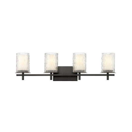 Iconic glass and metal construction makes an impact in contemporary space as this four-light vanity light sets itself apart. Intricate detail is textural and artisan with clear glasswork in a cylinder shape, with an inner white diffuser. Etched opal and clear glass blend as they enhance bold matte black finish framing and show off a crisp mix of circles and lines.