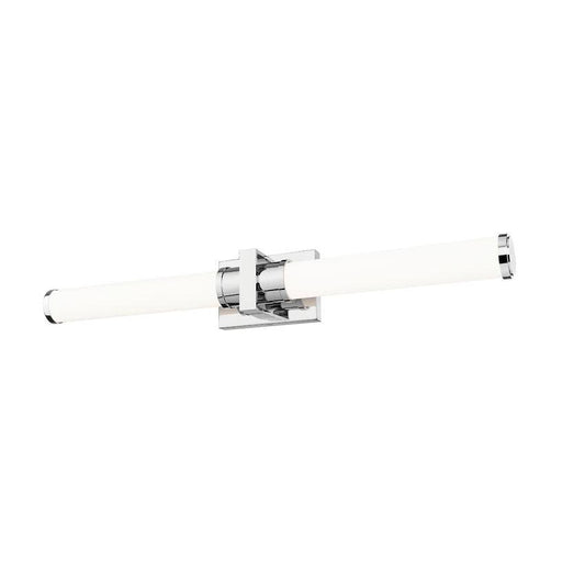 A bright, gleaming chrome finish brings maximum versatility to this modern LED vanity bath light. Its cylindrical opal glass shades are enhanced with a decorative square cuff and rectangular wall plate, offering crisp, fresh style and sophistication. The fixture includes an integrated LED light source, which is dimmable and includes five selectable color options to create just the right ambiance.