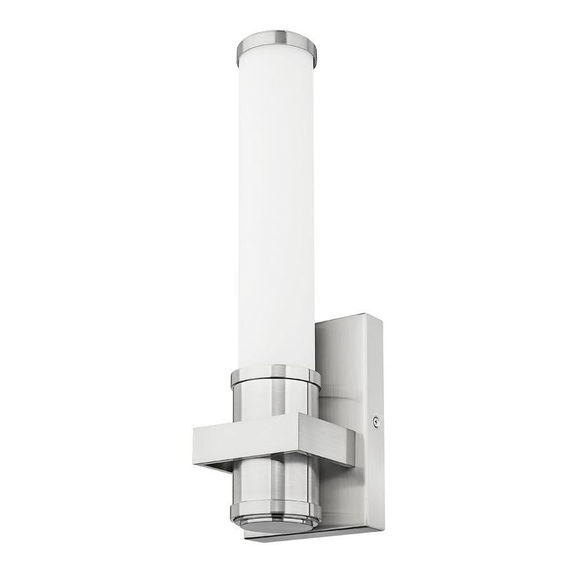 A brushed nickel finish square cuff and cylindrical light create chic style for this modern LED wall sconce. Perfectly adapted for a variety of settings, it features an energy efficient, dimmable LED light source and a chic opal glass shade that casts soft, inviting illumination. The light is dimmable and color selectable, creating flexibility to suit any space.