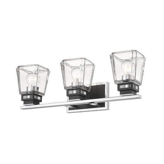 Linear design elements with elegant materials deliver a must-have look for a custom living space. Mid-Century Modern flavor stylizes this three-light vanity light, showcasing thick square glass shades mounted to a brilliant Chrome finish frame with a Matte Black surface and a tasteful transitional expression.