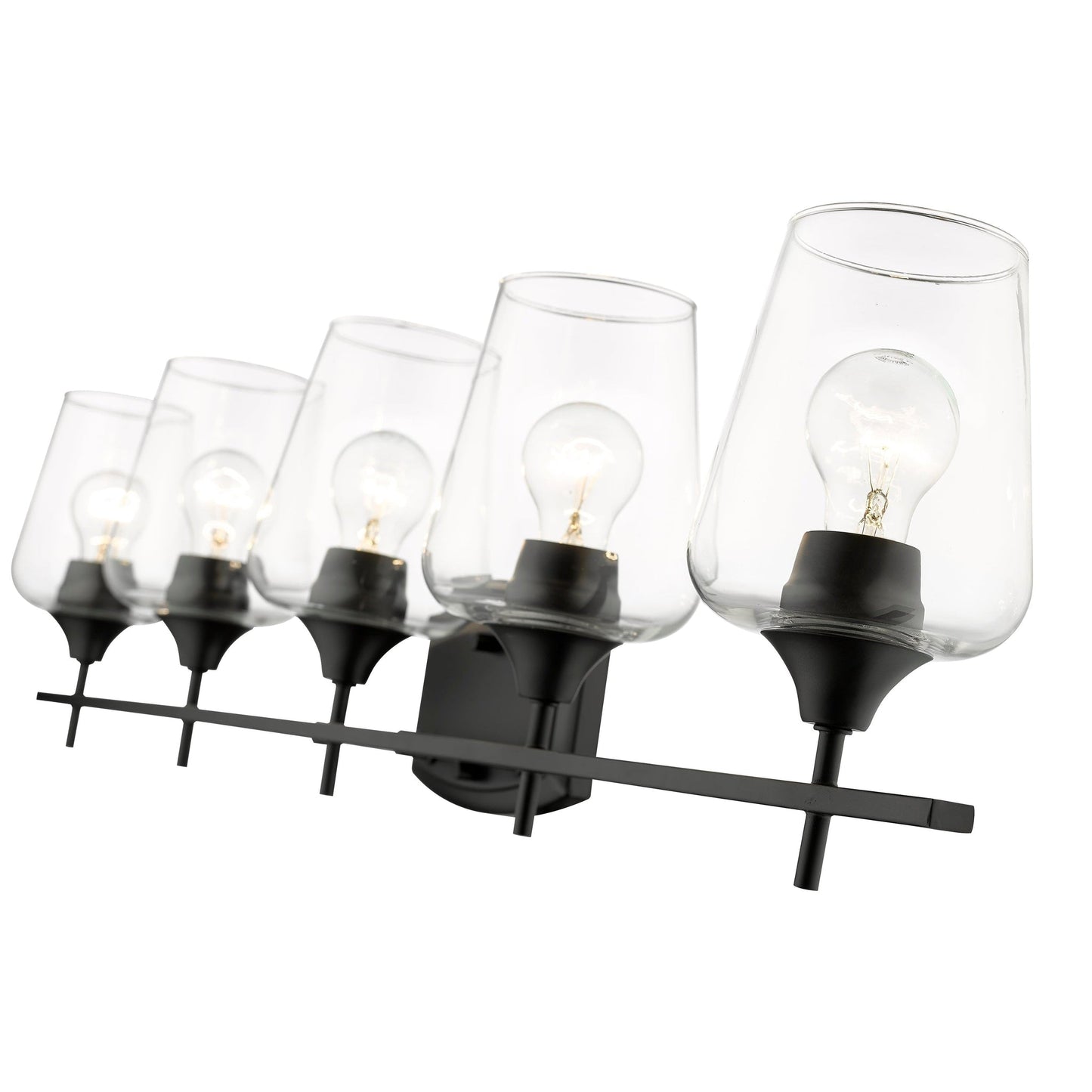 Upscale sophistication with a Mid-Century Modern vibe tells the story of this elegant five-light vanity light. A blend of delightful materials offers stunning large glass shades with bold Matte Black finish metal, offering an enticing frame to illuminate a custom master or guest bath sink.
