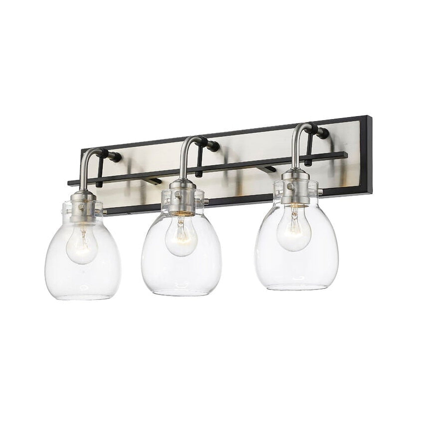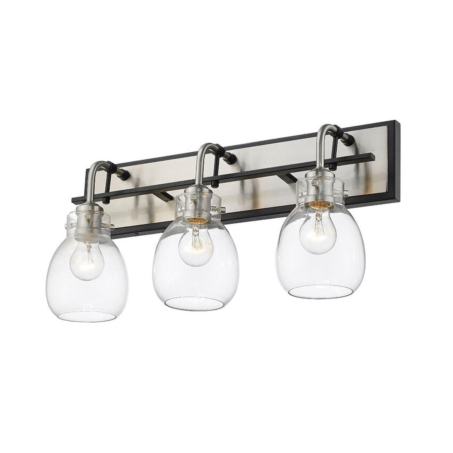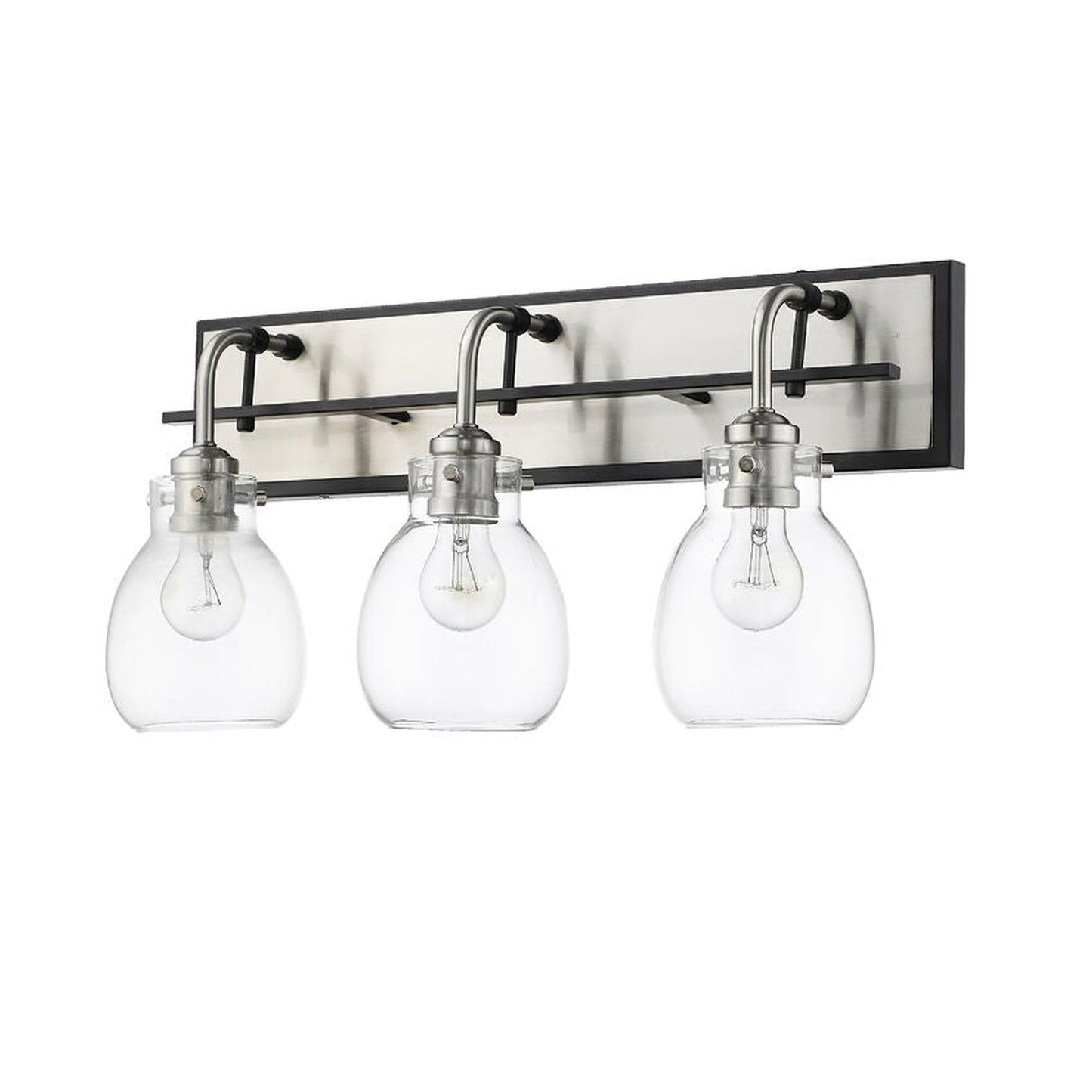 Sleek lines and clear, rounded details combine on this three-light bath light. Stunning above a bathroom vanity, the glass shades cast a bright glow from the dual tones of matte black and brushed nickel.
