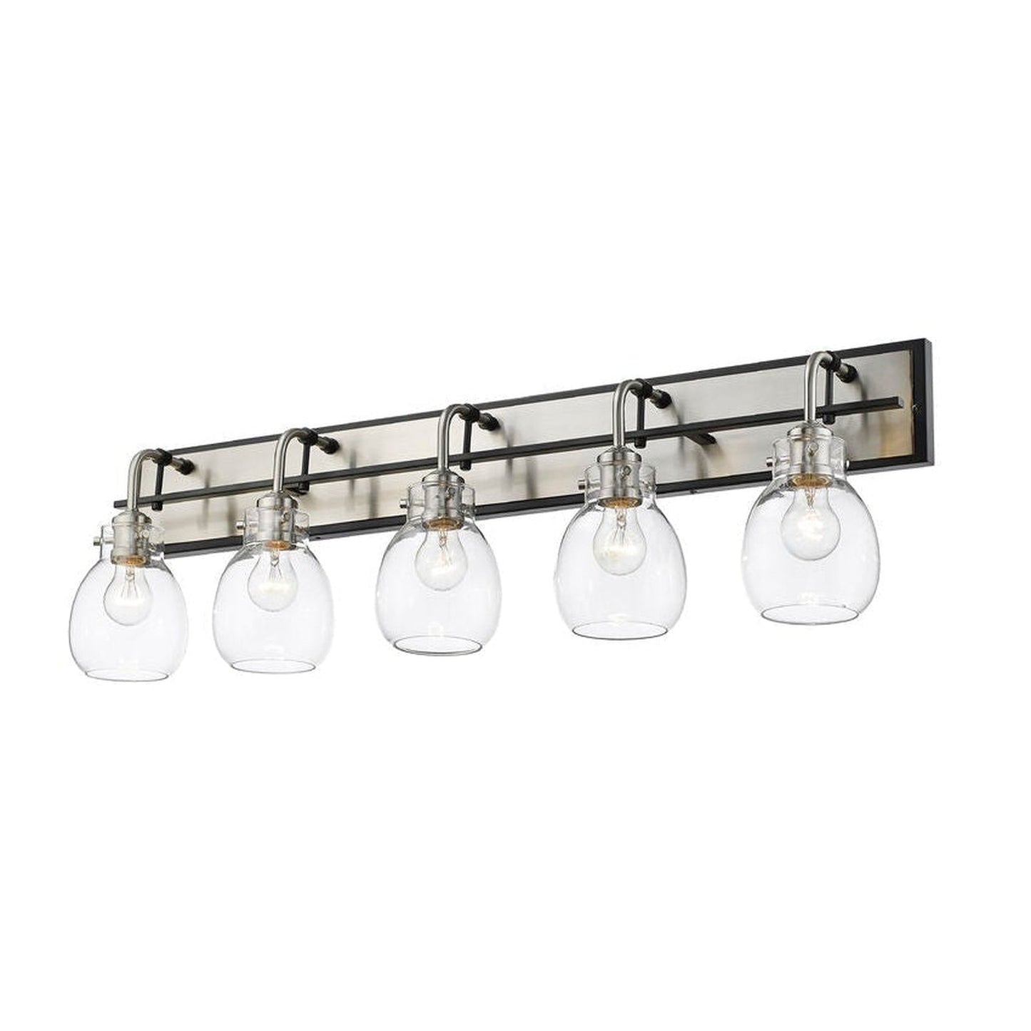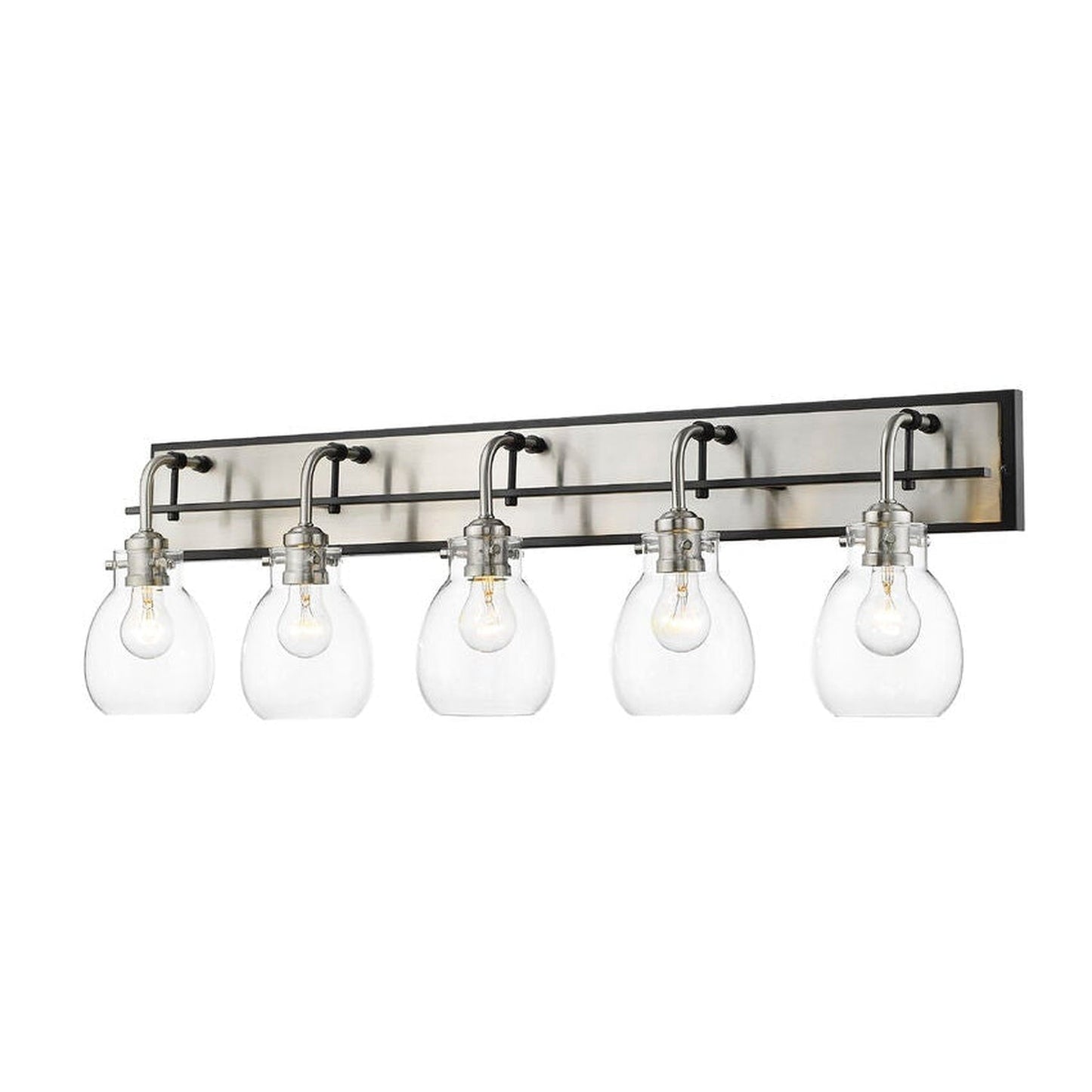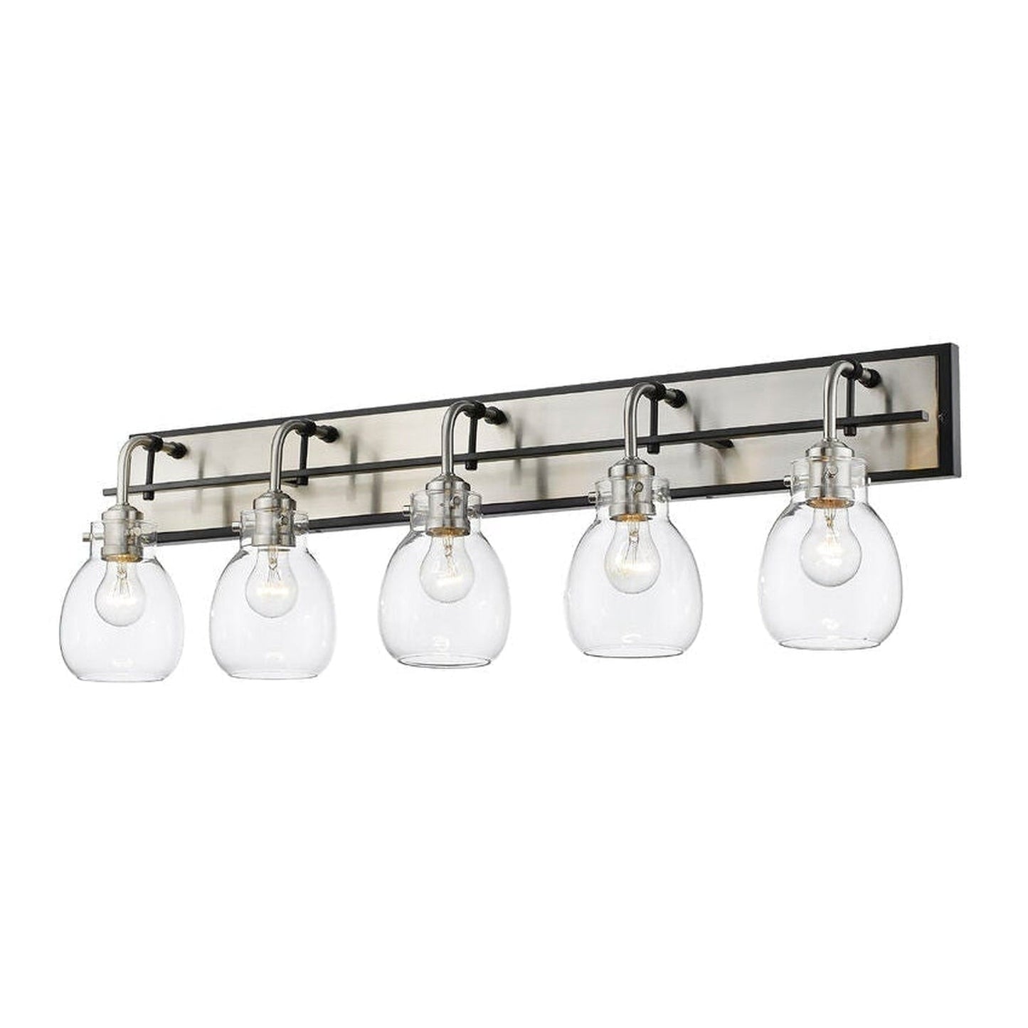 Matte black and shiny brushed nickel marry on the sleek silhouette of this five-light bath light. Decorate a modern bathroom with the elongated silhouette and bright, clear glass shades.