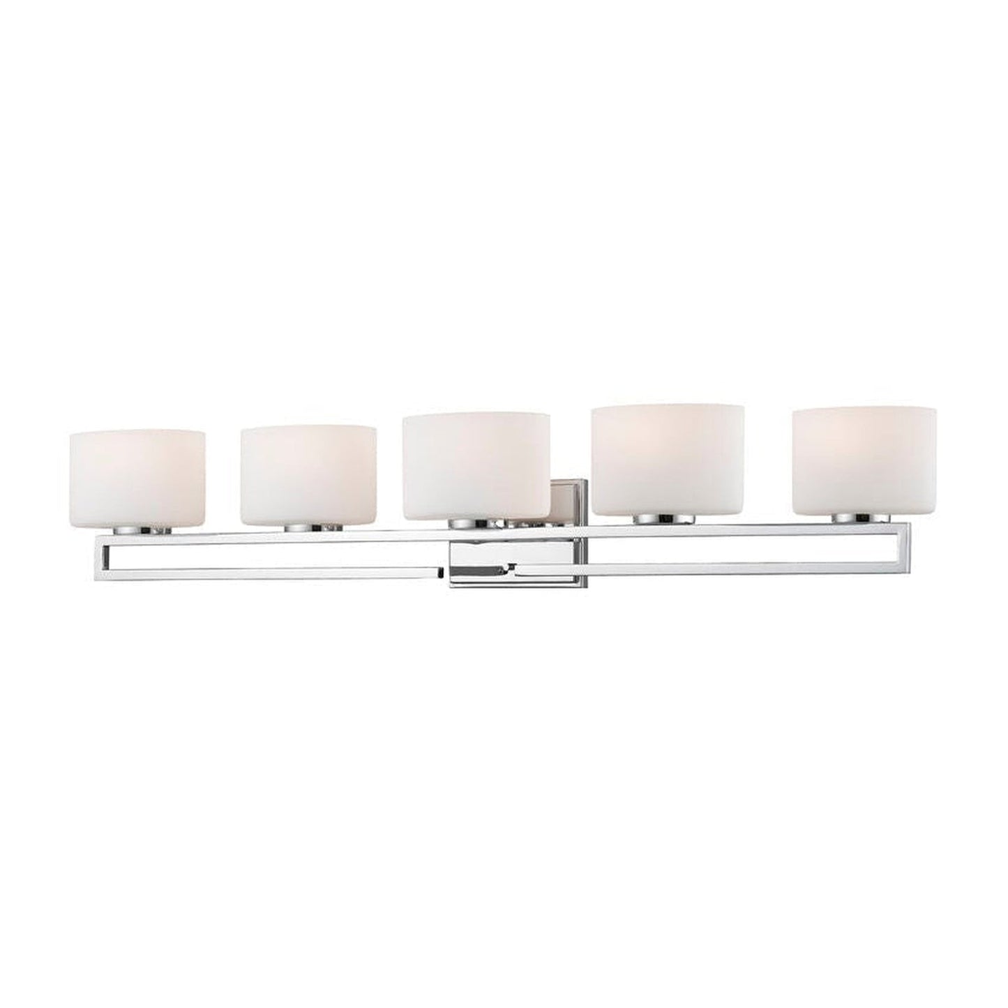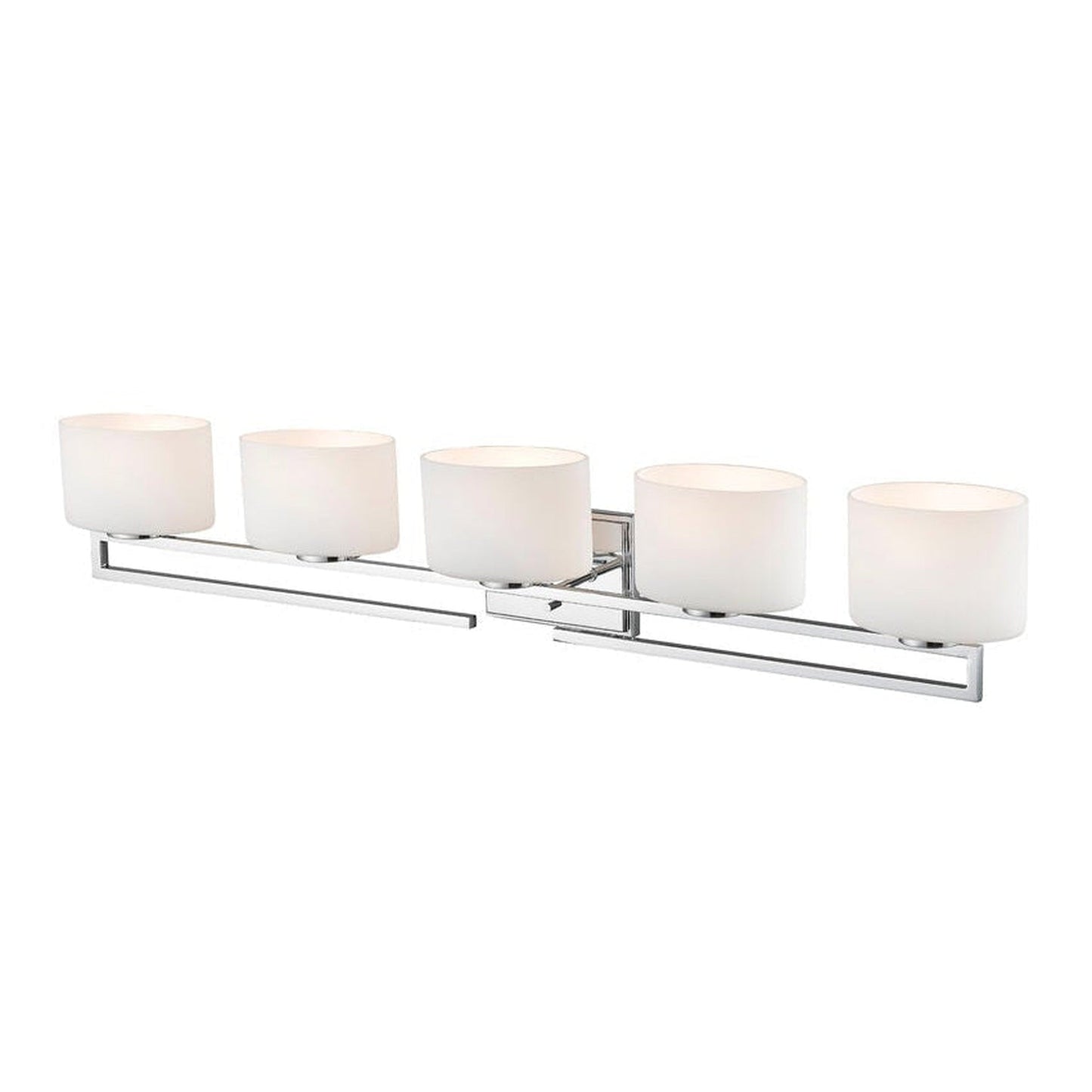 With an abundance of personality, the design of this five-light vanity fixture blends clean geometric lines with gently curved shades. Shiny chrome finish steel forms a stylish frame hosting shades crafted from matte opal glass, providing an Art Deco-influenced aesthetic and energy-saving lighting with the convenience of dimmable levels.