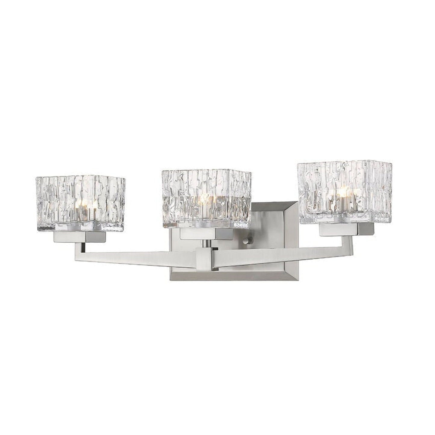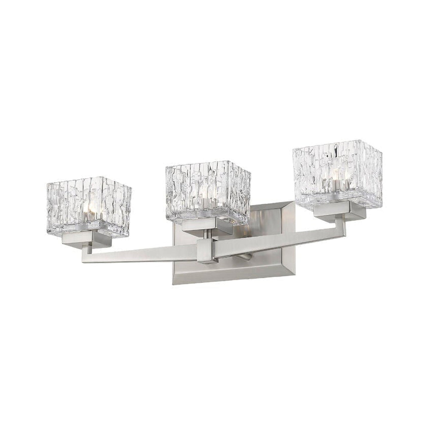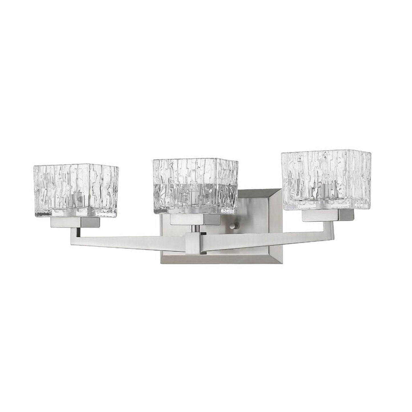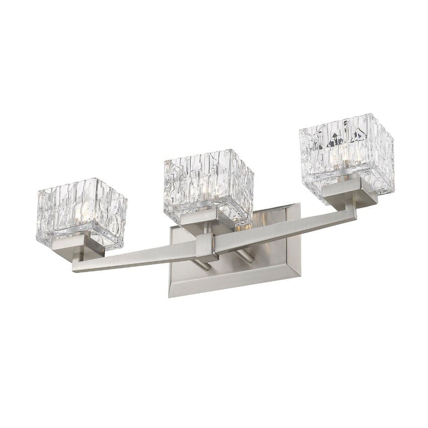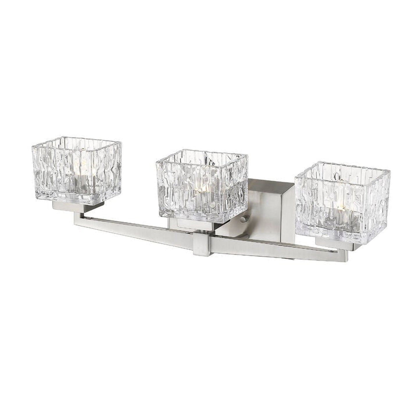 Modern design creates a silhouette worth showcasing in contemporary bath space. This brushed nickel steel and crystal cut clear glass three-light vanity becomes a focal point in a remodeled or custom bathroom.