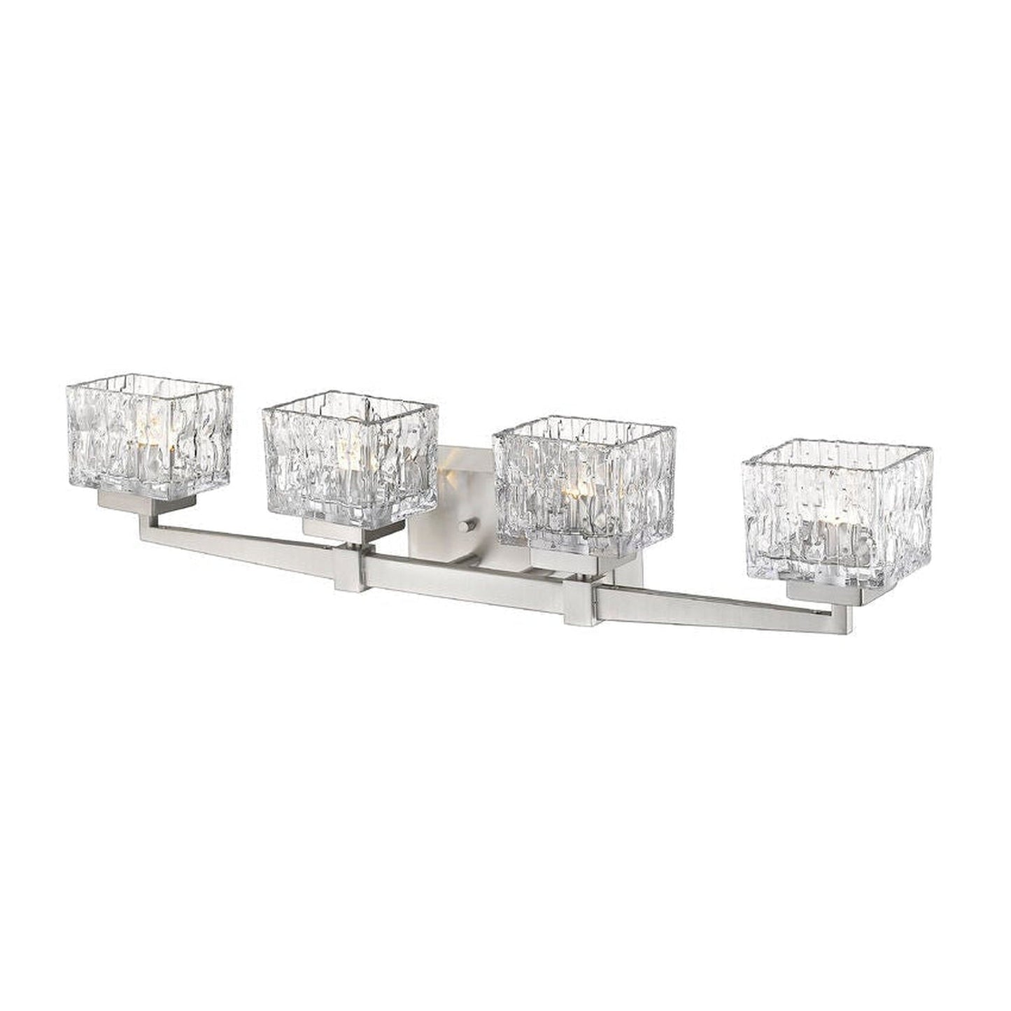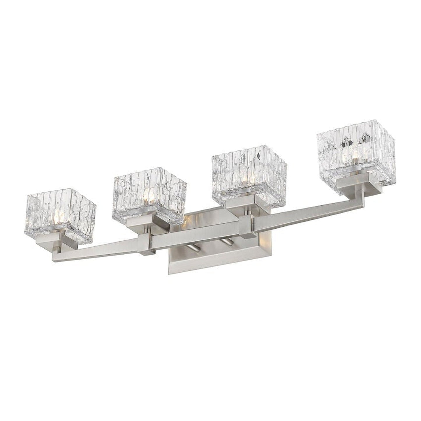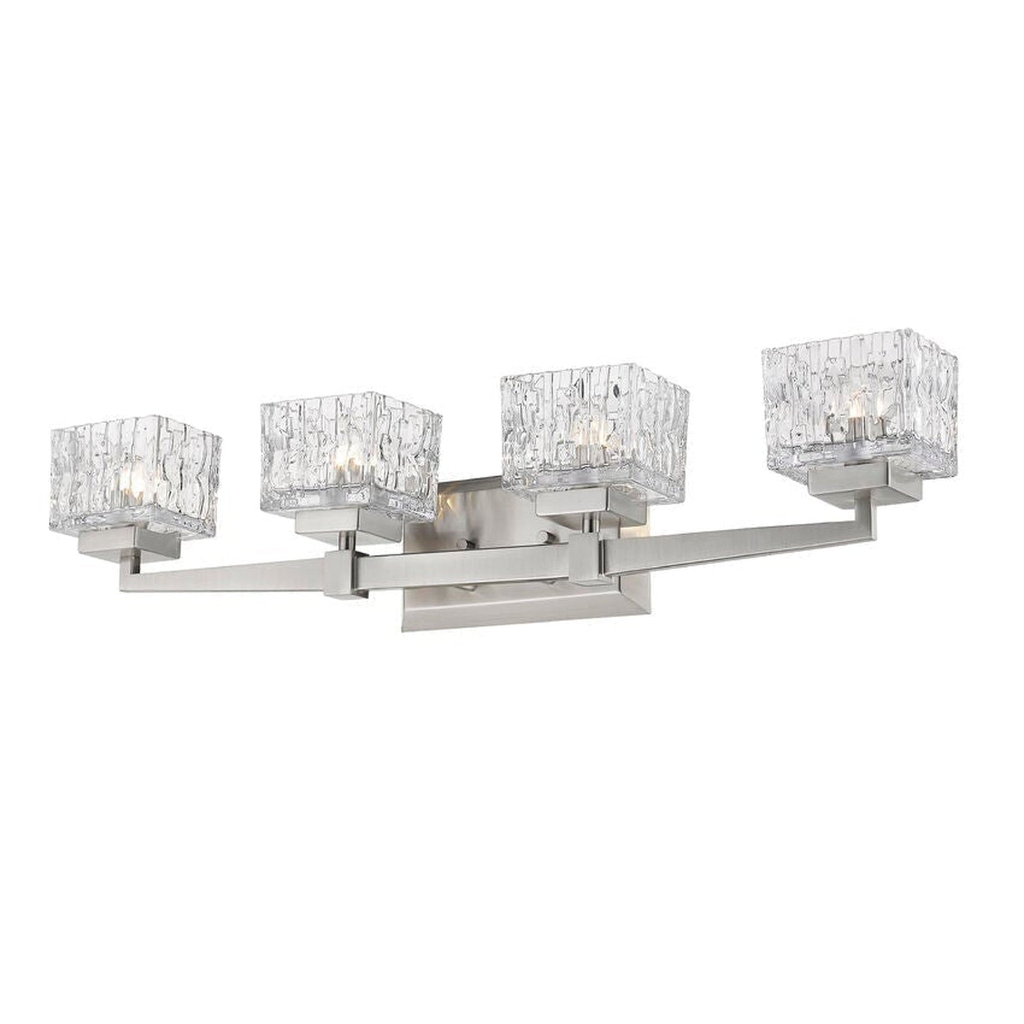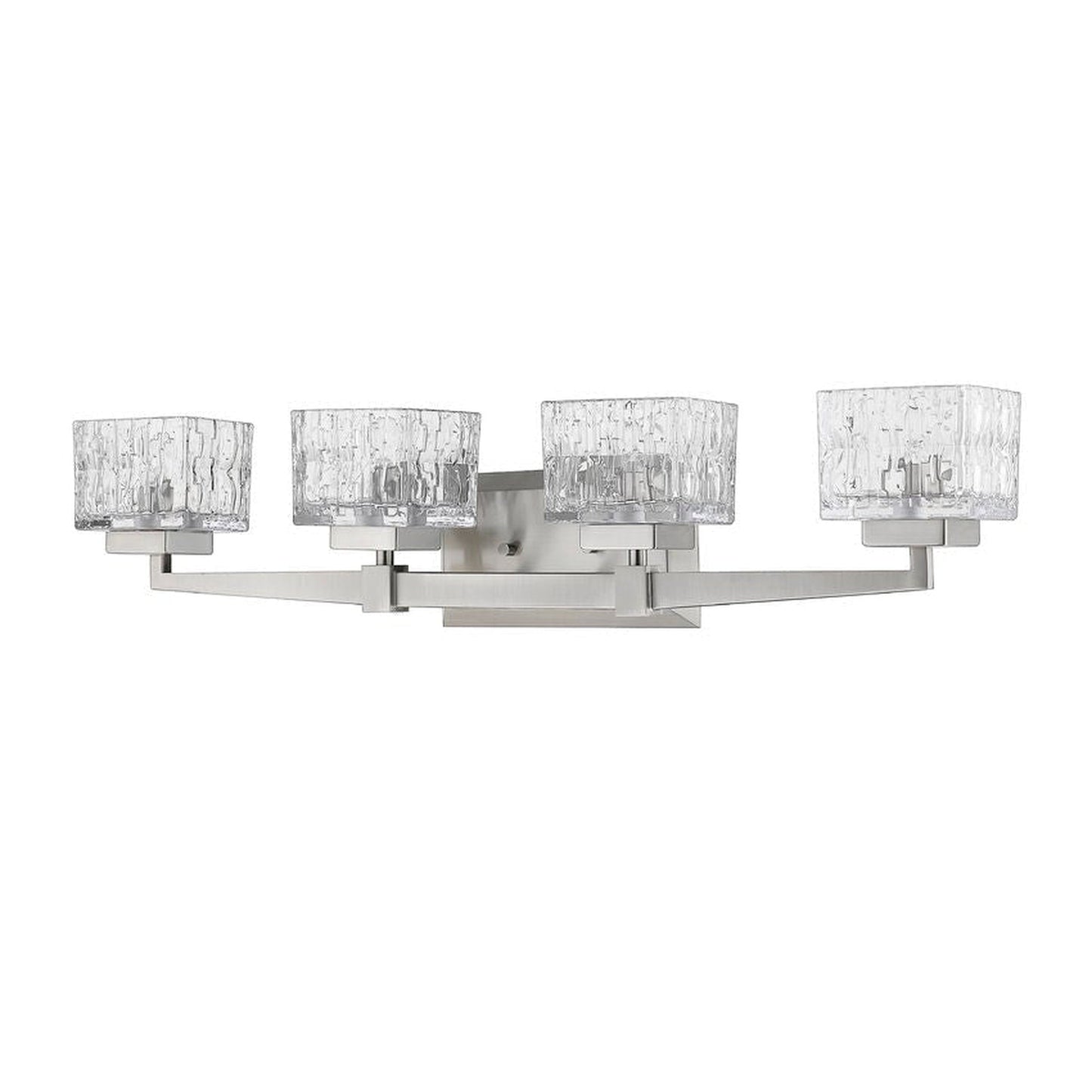 A new personality emerges in a contemporary bath space with the addition of this brushed steel finish four-light vanity light. Chic detailing transforms a steel frame into a work of art complete with crystal-cut clear glass shades for an energetic effect.