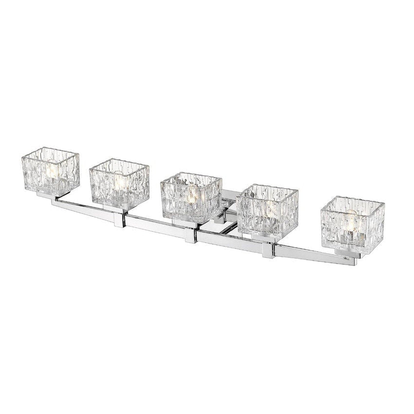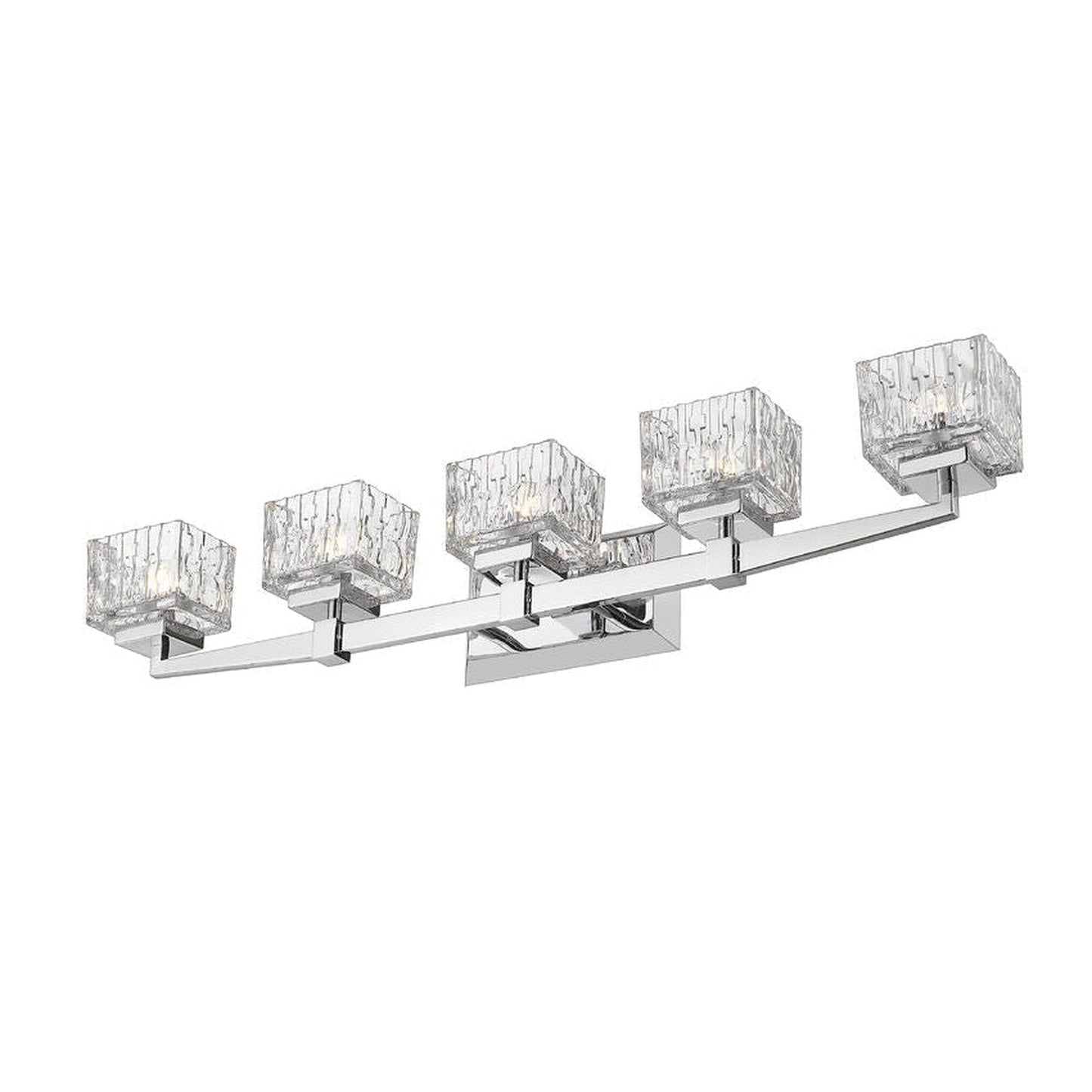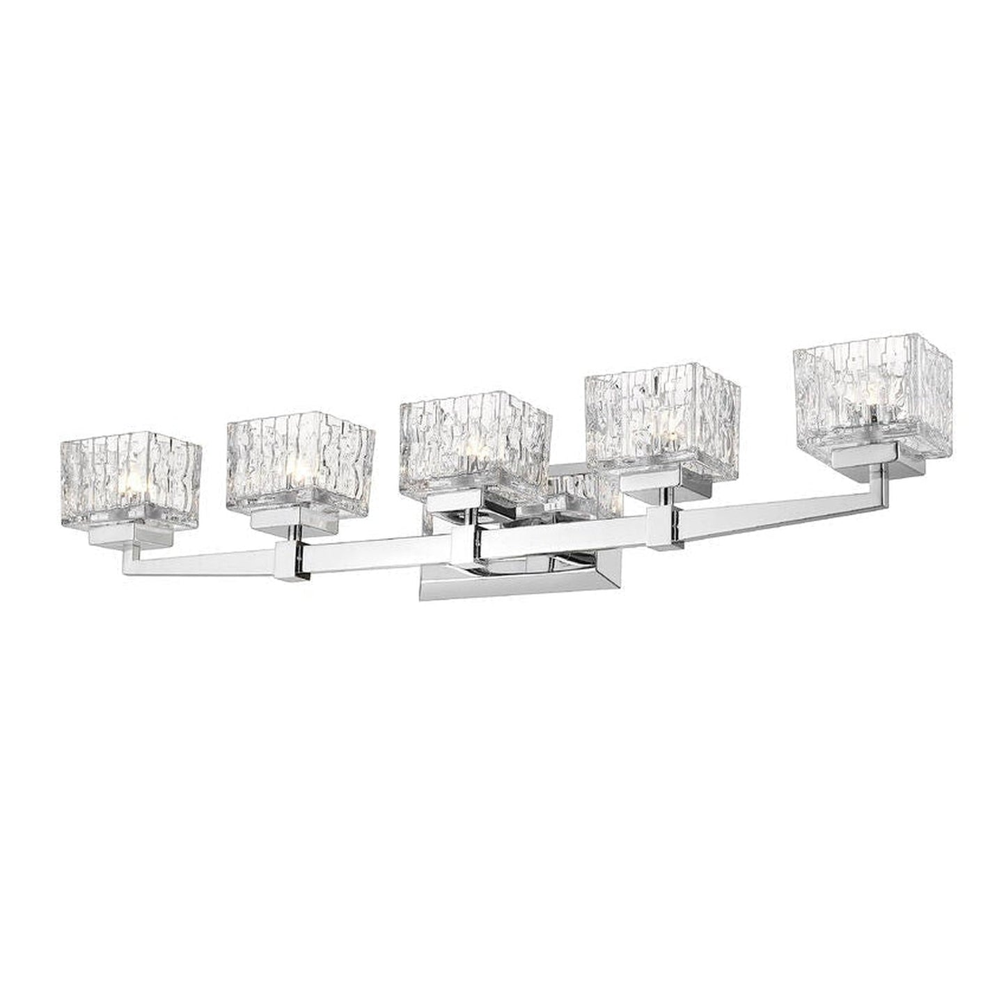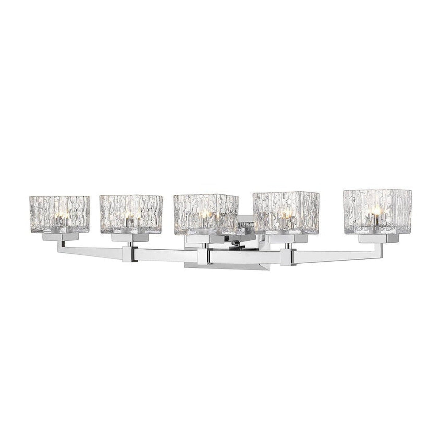 This chrome finish five-light vanity light energizes a contemporary bath space. Take advantage of a tasteful Art Deco-inspired silhouette and the beautiful pairing of chrome steel and clear glass.