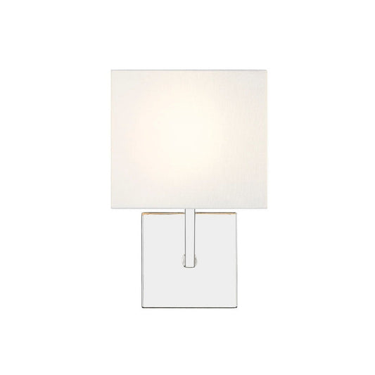 Add a spirited contemporary look with light style, choosing this one-light metal sconce to infuse targeted lighting in a modern bath or living space. This light from the Saxon collection features a clean silhouette with a backplate and arm made of brilliant polished nickel finish steel and a box shade wrapped in crisp white fabric.
